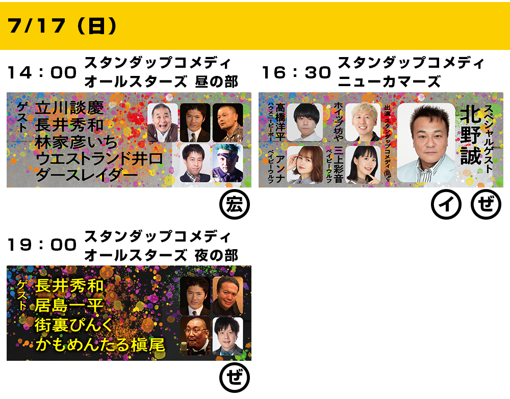 毎公演、清水宏、ぜんじろう、ラサール石井、インコさん(日本スタンダップコメディ協会メンバーから2名)と公演ごとにスペシャルゲストとお送りします!