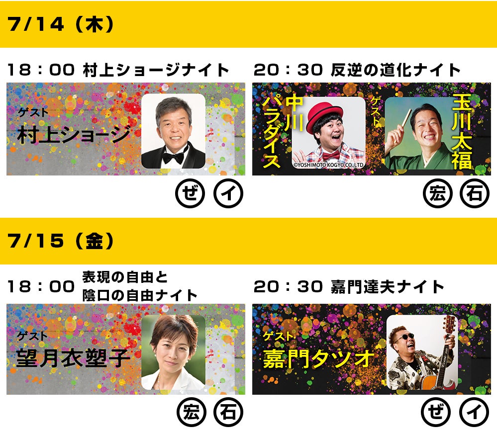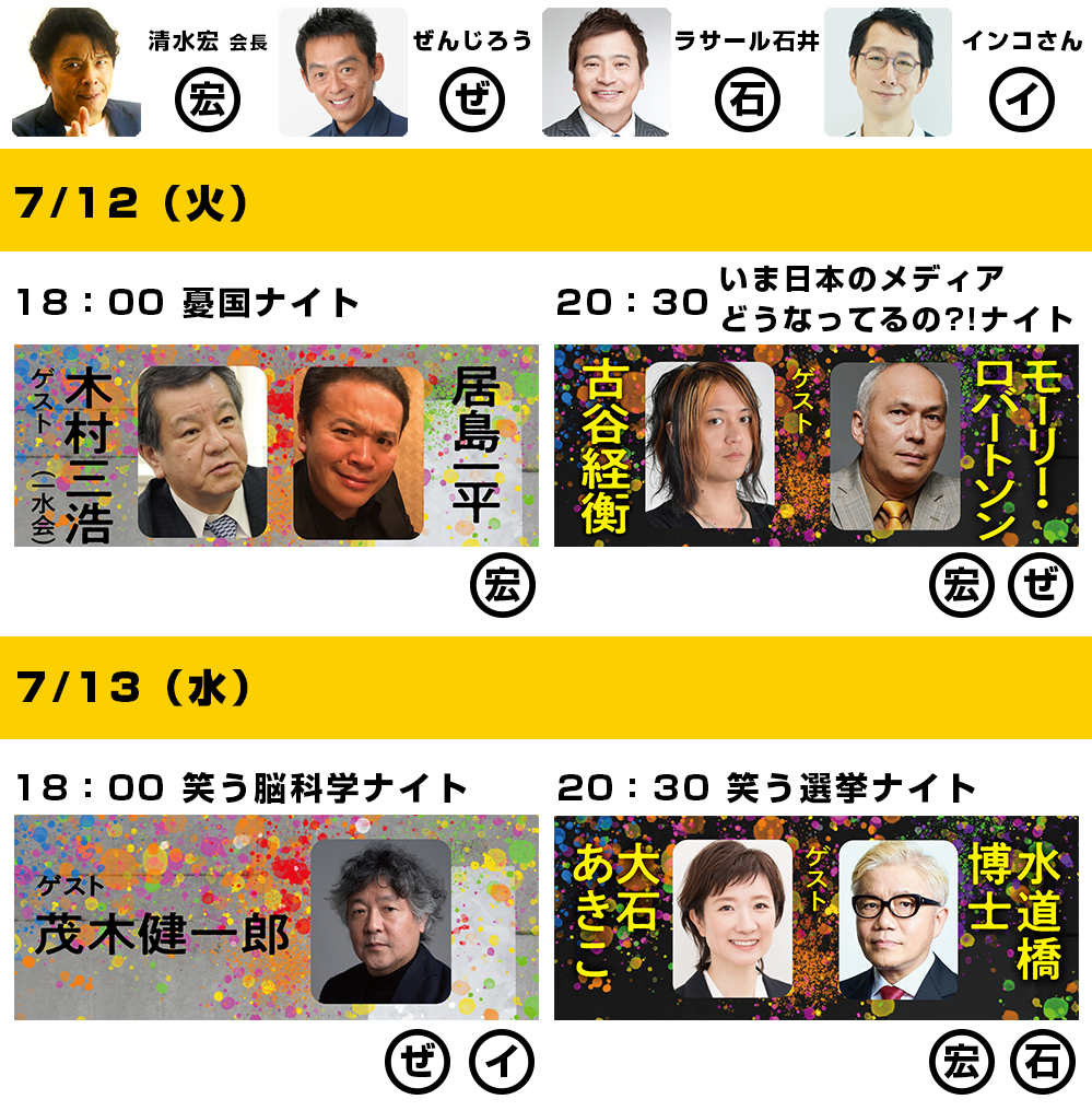 モーリー・ロバートソン、望月衣塑子、久本雅美、いとうせいこう、ダースレイダー、水道橋博士、大石あきこ、村上ショージ、嘉門タツオ、長井秀和、居島一平、立川談慶、玉川太福、コラアゲンはいごうまん、かもめんたる槇尾ほか、