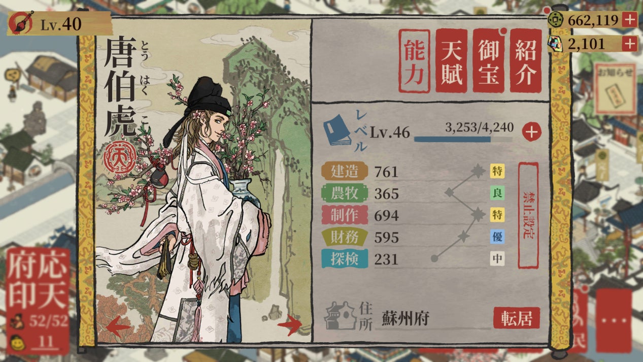 100名以上の特殊住民(キャラクター)がおり、それぞれに得意分野と専属の能力(天賦)がある。町づくりにおいて、彼は各々異なる役割を担うことになる。キャラクターごとに専属の装備(宝物)が存在し、適切な宝物を装着することによって、能力を大幅に増幅させることもできる。
