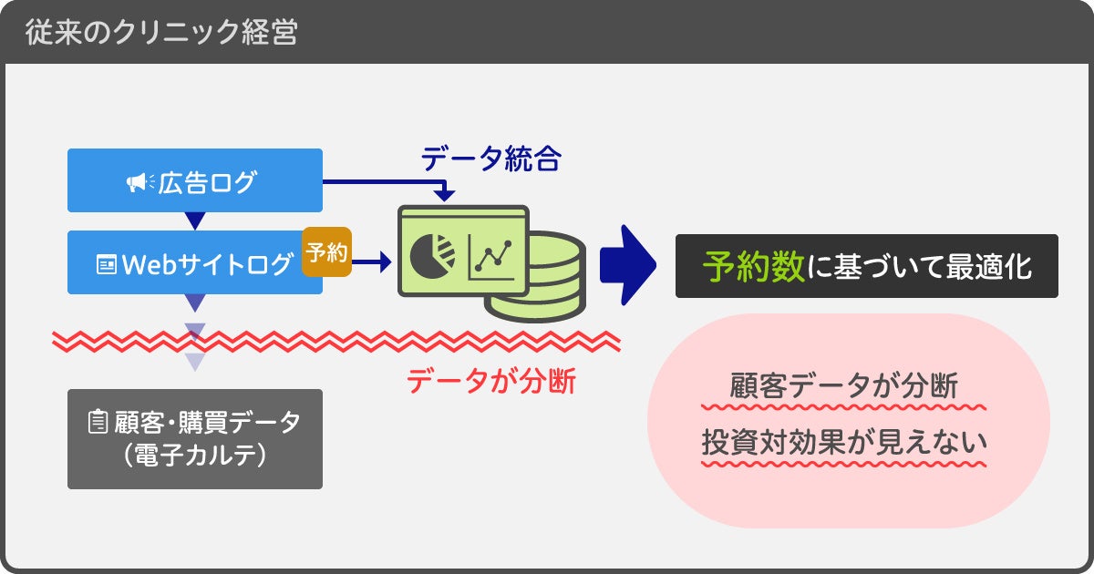 このような弊害の原因は、広告ログやアクセスデータと、売り上げの情報を持つ電子カルテのデータが分断されていることにありました。