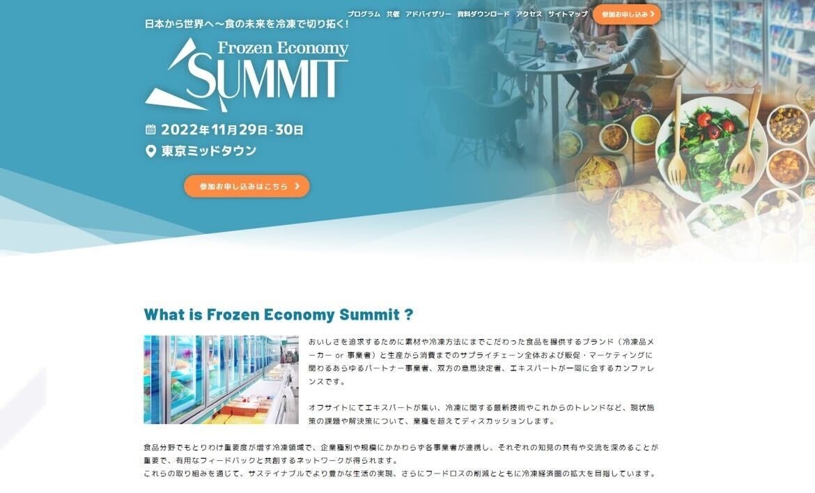 併せて、“冷凍品”に関するトレンド・あらゆる課題や解決策などを、業種を超えてディスカッションするカンファレンス「フローズンエコノミーサミット@東京ミッドタウン」を、2022年11⽉29⽇(⽕)・30⽇(⽔)の2⽇間開催することが決定し、参加企業の募集を開始します。