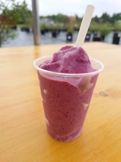 - 摘み取ったブルーベリーをトッピングするブルーベリーピザ体験 800円、ブルーベリースムージー400円、ブルーベリージェラート300円 ※土日・祝日のみのサービス量り売り価格100g 700円のブルーベリーであり、提供するフードは出血大サービス価格となっています。色々なブルーベリーの楽しみ方を知っていただきたいという思いからご提供しています。