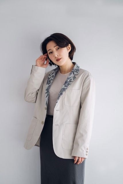 一番人気は袖折り返しジャケット(ユニセックス)。袖の折り返し部分とポケット部分にお客様の持ち込み素材が入り、さりげない柄使いが映えるデザインとなっております。パンツを合わせてセットアップで着ていただくのがおすすめです。
