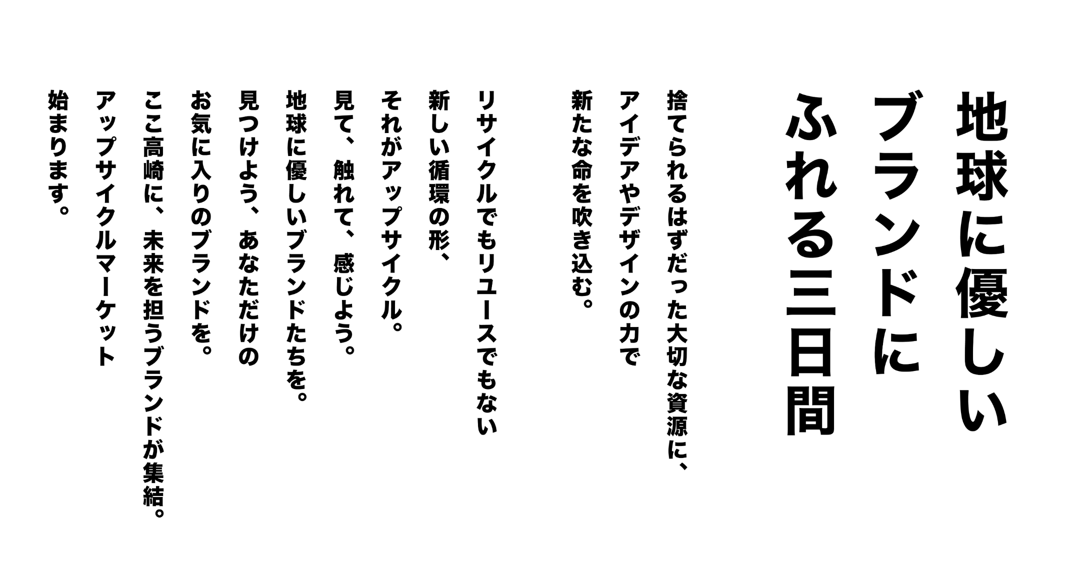 概要:ファッション、アクセサリー、クラフトペーパー、タンブラーなど、様々なジャンルの次世代×ローカルアップサイクルブランドによるポップアップショップとワークショップからなるマーケットイベント。