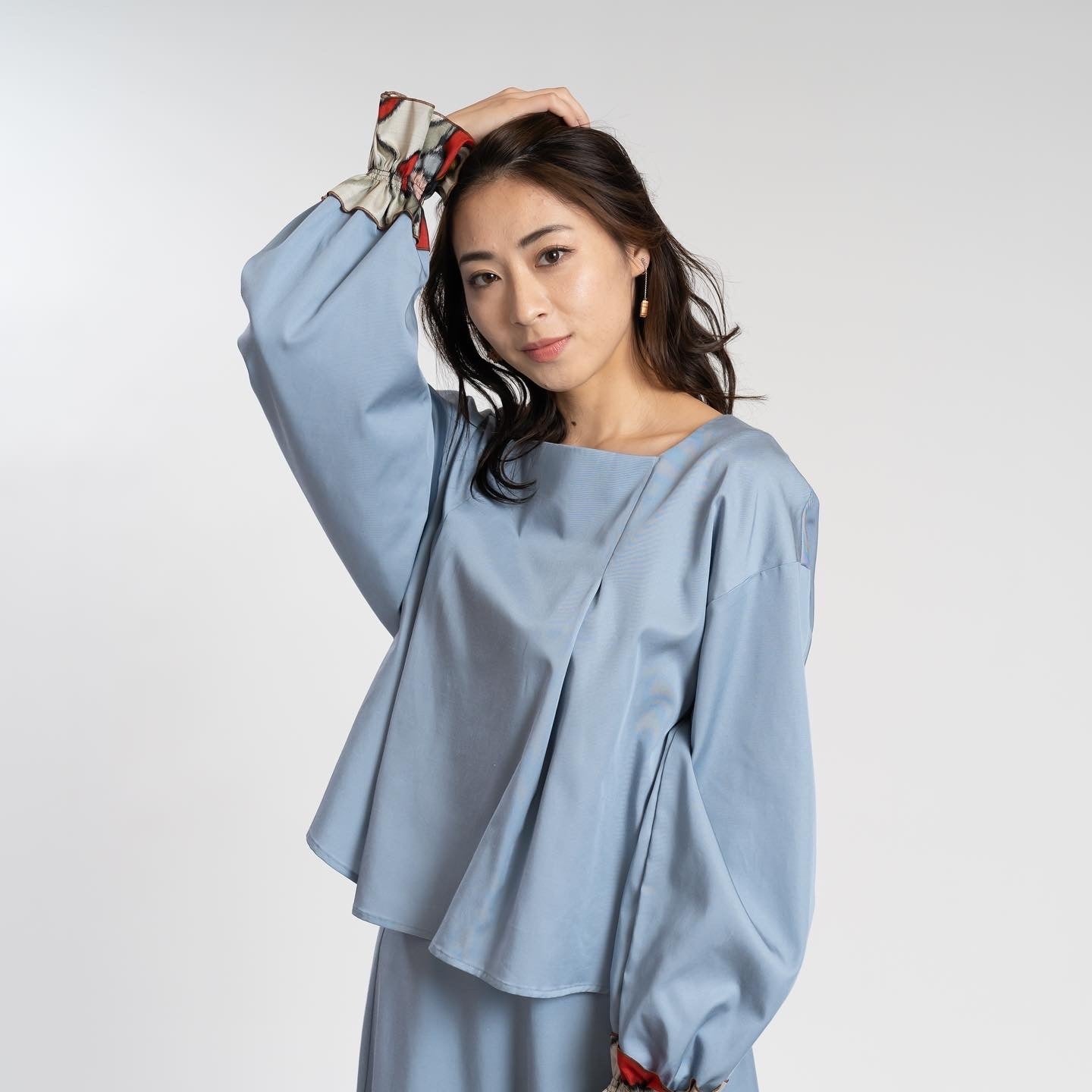 1着の着物から1着の【銘仙ティアードスカート】は、鮮やかで大柄の銘仙を贅沢に使い、オーガニックコットン生地を胴体部分に使用しています。袖部分と首後ろに銘仙を使った【銘仙スクエアネックブラウス】はユーカリ由来の生地と銘仙を合わせ、文化をさりげなくお楽しみいただけます。