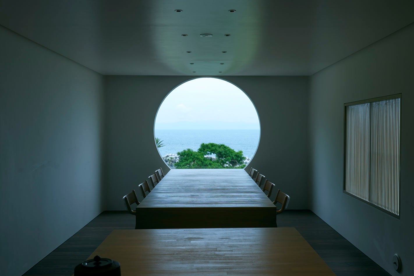 新たな『石上』の顔ともいえる、満月のダイニングは昼と夜でその表情を変えます。昼は海に反射する太陽の光が駿河湾の美しさを際立たせます。夜は「月をお迎えする」ように、駿河湾に浮かぶ月をのぞみ、時によって月光が織りなすムーンロードもお楽しみいただけます。白を基調としたダイニングテーブルに座りお召し上がりいただくお食事は、他の宿にはない唯一無二の『石上』の価値だと考えています。