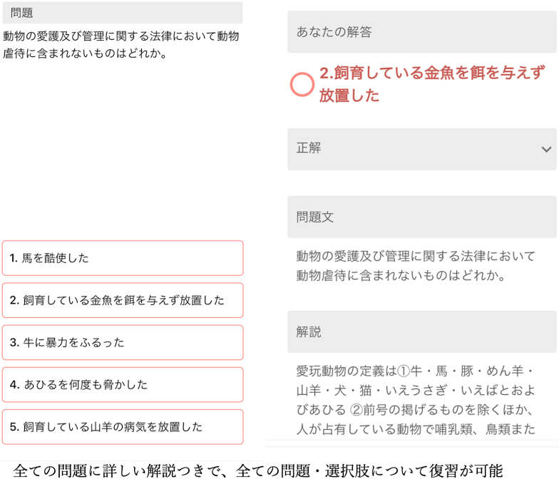 愛玩動物看護師国家試験コアカリキュラムに準拠した問題を約700問収録し(※リリース時点。現在は800問を収録)、学習者はスマートフォンからいつでも手軽に問題演習を行うことができます。忙しい動物看護師の皆様も、すきま時間を活用して気軽に国家試験対策を行っていただけます。全ての問題に詳しい解説がついており、正解した問題も、間違えた問題も、解説を読むことでより深い理解へと導きます。