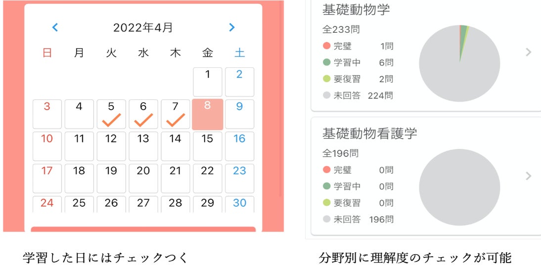 今回リリースしたアプリ「どうぶつ看護ポータル」では、問題演習を行い、更に苦手分野の視覚化や復習によって、日々の学習管理と国家試験の対策をサポートします。