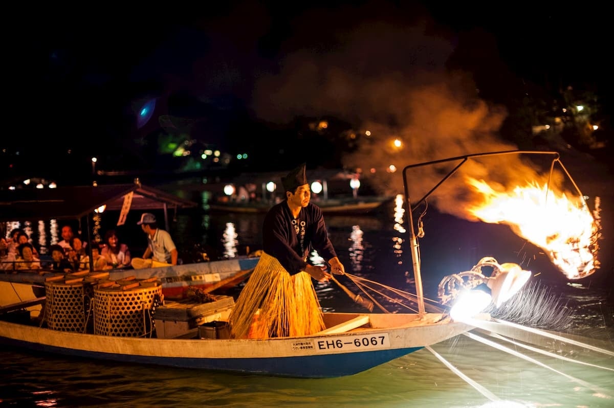 大洲の夏から秋にかけての風物詩。伝統的な装束に身を包んだ鵜匠が、小舟の上から鵜を巧みに操り鮎を捕らえる。揺らぐ炎に照らし出される、迫力の光景をその目に。