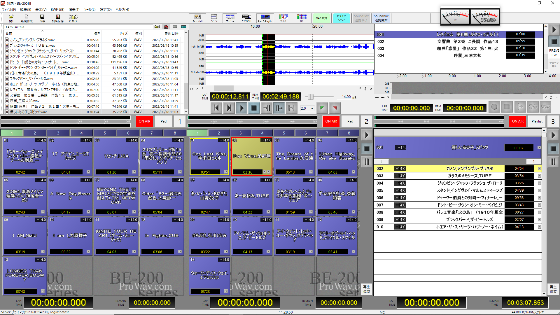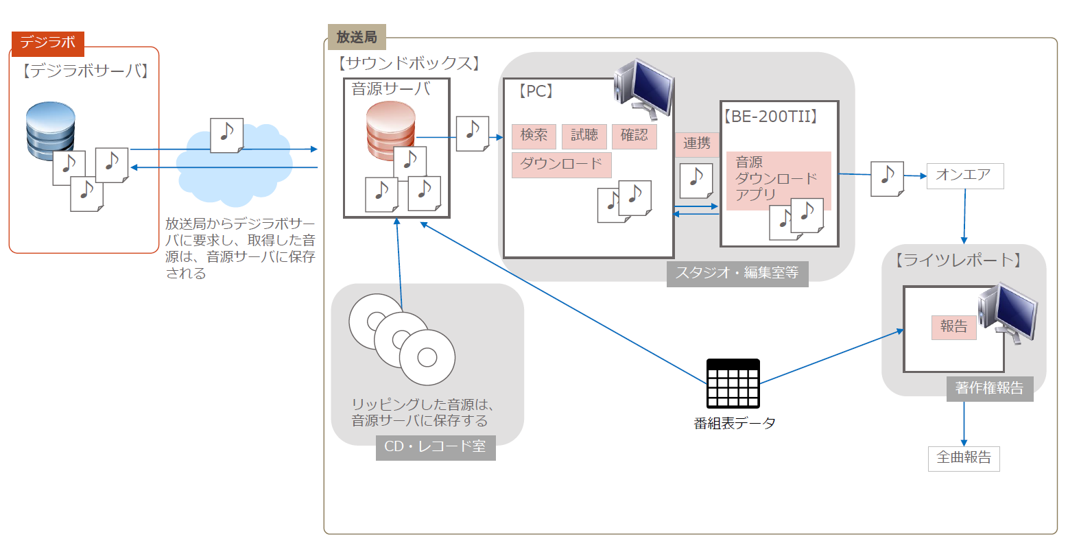 デジラボがディストリビュートするBE200シリーズ最新バージョンBE-200TII-Dでは、単体でのご利用はもちろん、ネットワーク接続をすることによって音源サーバシステム「ミュージック・ラテ サウンドボックス」との連携や、BE-Serverシステムを構築して放送番組音源やCM音源の高度な管理が可能になります。