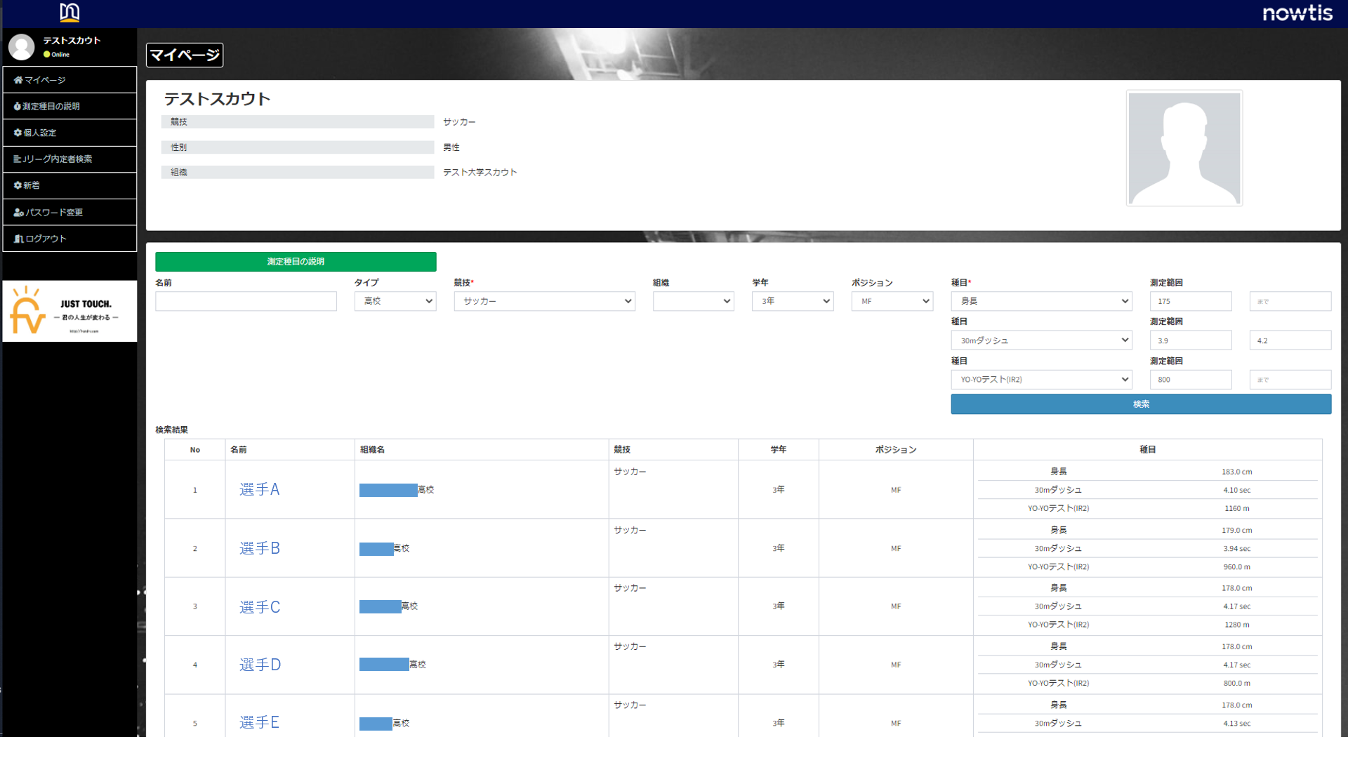 高校生が練習参加に来る機会がありますがnowtisでフィジカルテストを受けている場合はデータを確認し選手の特徴をイメージ出来るので大変便利です。