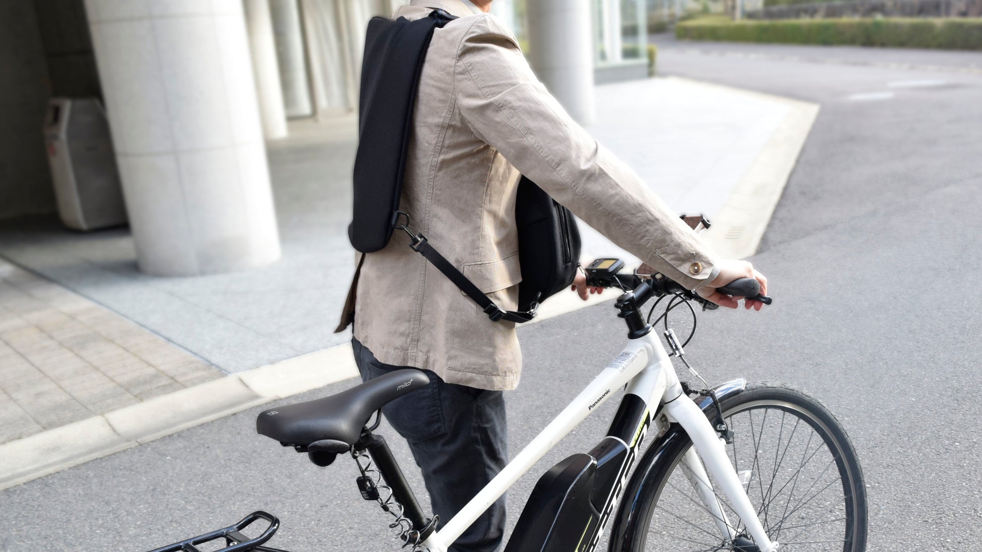 前と後ろを固定する付属のベルトを装着すると体によりフィットするので前傾姿勢をとるスポーツタイプの自転車通勤にも最適です。