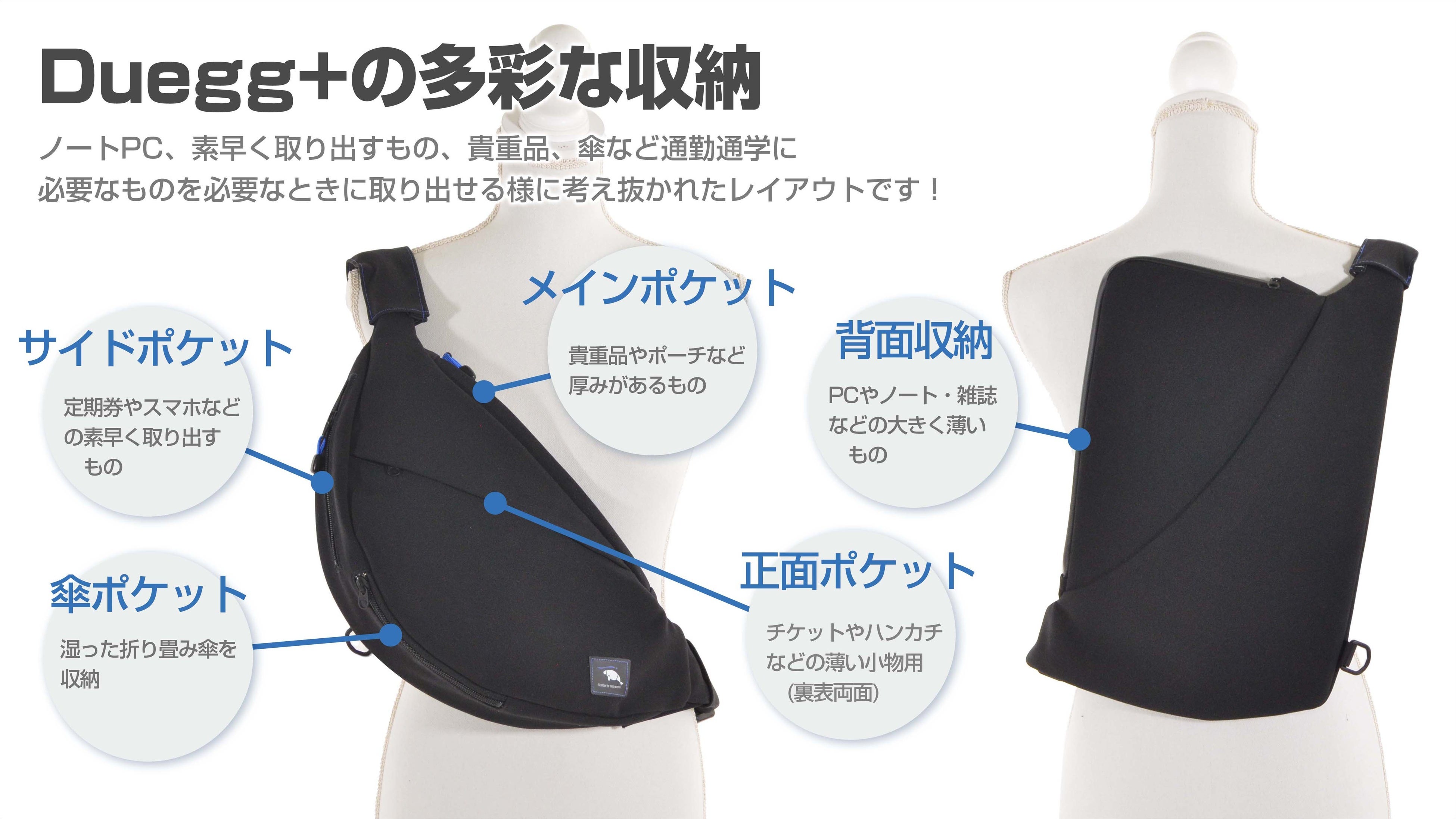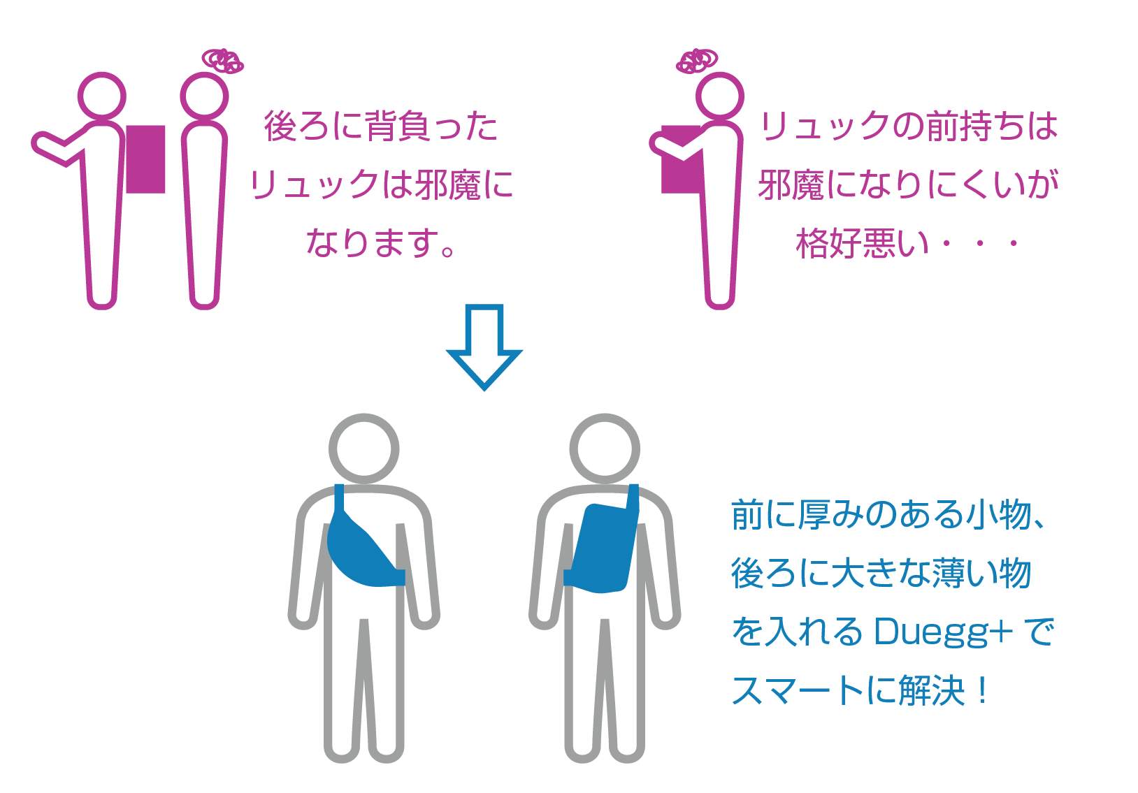 ・その欠点を軽減させ、前もちリュックと同じような利点が得られるものが、今回クラウドファンディングを行う『Duegg +』