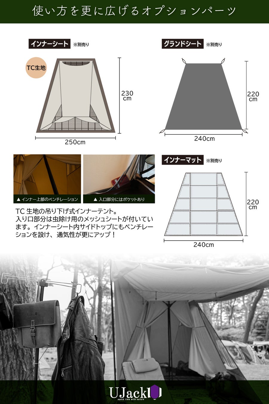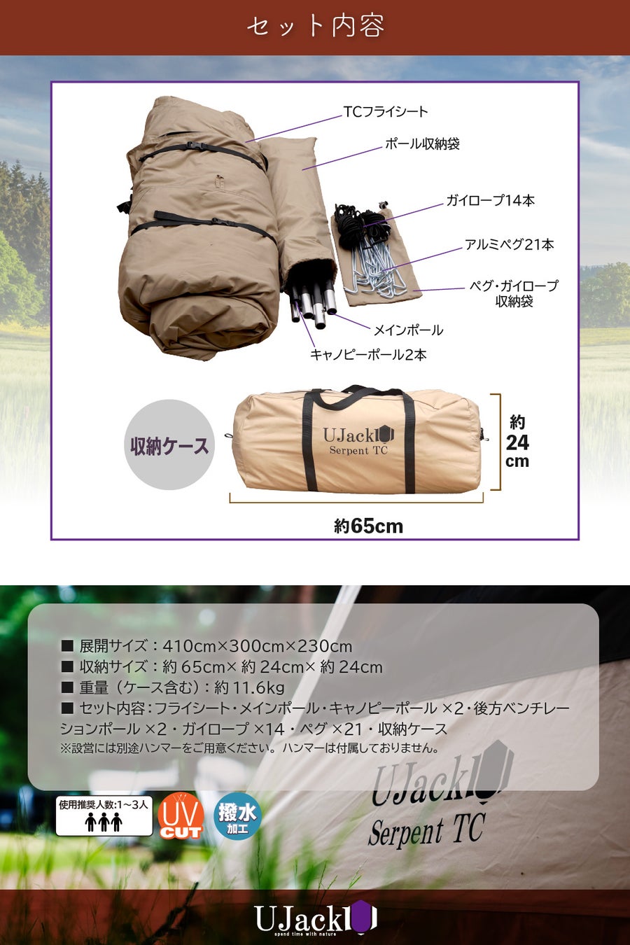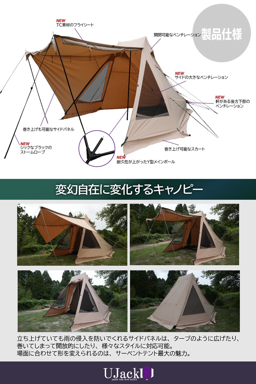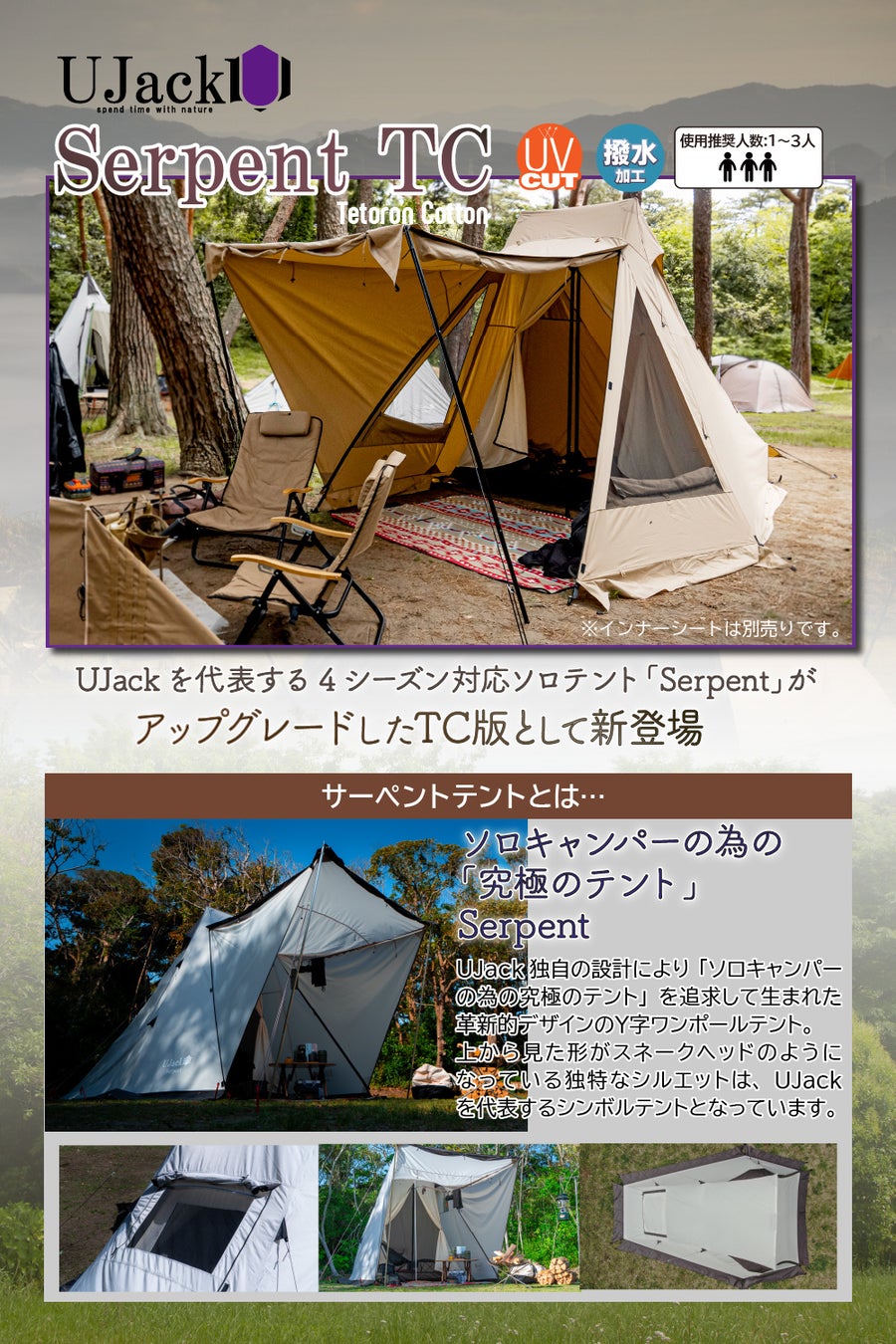 UJackの大人気テントシリーズSerpentに新たにTC生地バージョンが追加。よりワイド設計&機能追加で快適性が格段に上がりました。