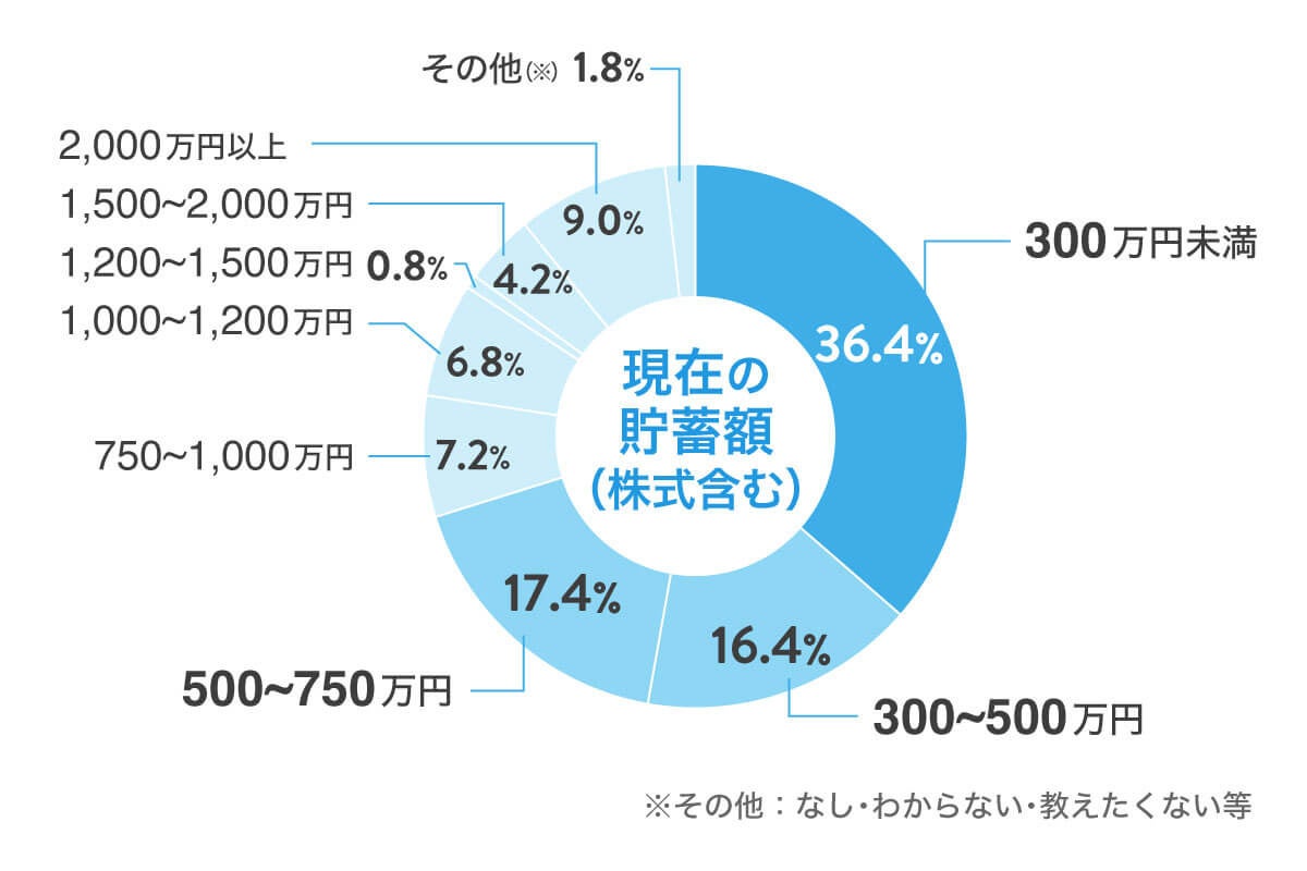 現在の貯金額(株式含む)について500名の方に伺ったところ、一番多かったのが300万円未満の36.4%でした。