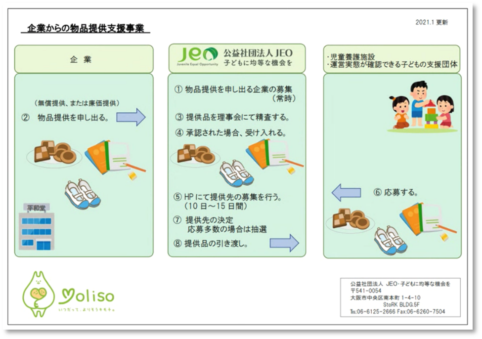 JEO は中小企業が法人賛助会員として多く参加し、「幼い子どもたちや生まれてくる生命のために、持続可能な社会の実現を目指す」をビジョンとする団体です。児童養護施設などへの支援、子ども食堂の実施、地球環境保全啓発セミナーの開催のほか、今回のように、子どもの健全育成のための良好な環境の実現を目指す法人の理念に賛同し、物品の提供を通じて社会貢献を目指す企業と、支援を必要とする施設との橋渡しをする「企業からの物品提供支援事業」を行っています。
