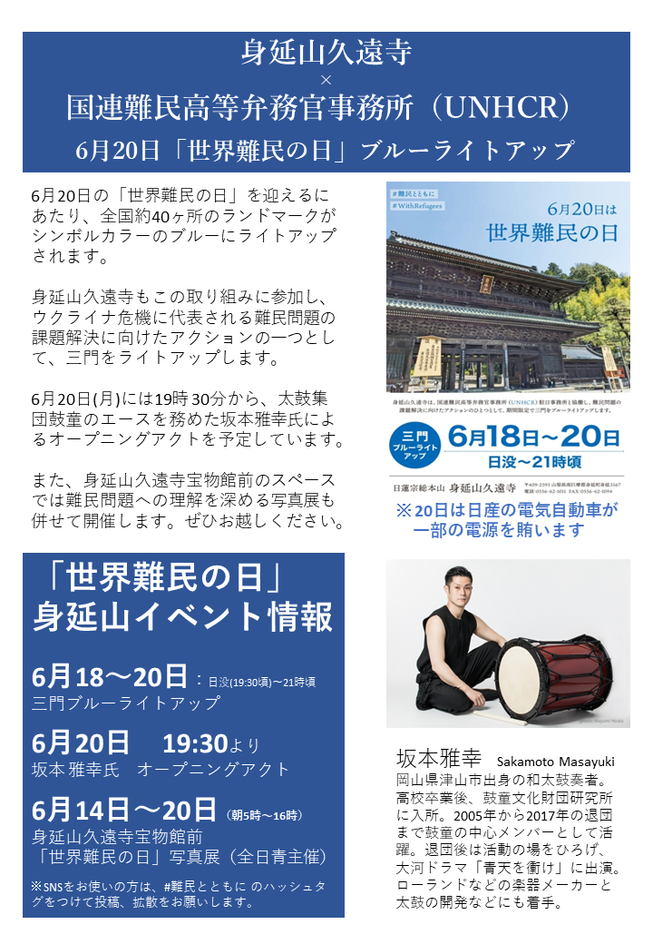 6月20日「世界難民の日」ブルーライトアップ身延山久遠寺×UNHCR×日産自動車×全日青イベント開催