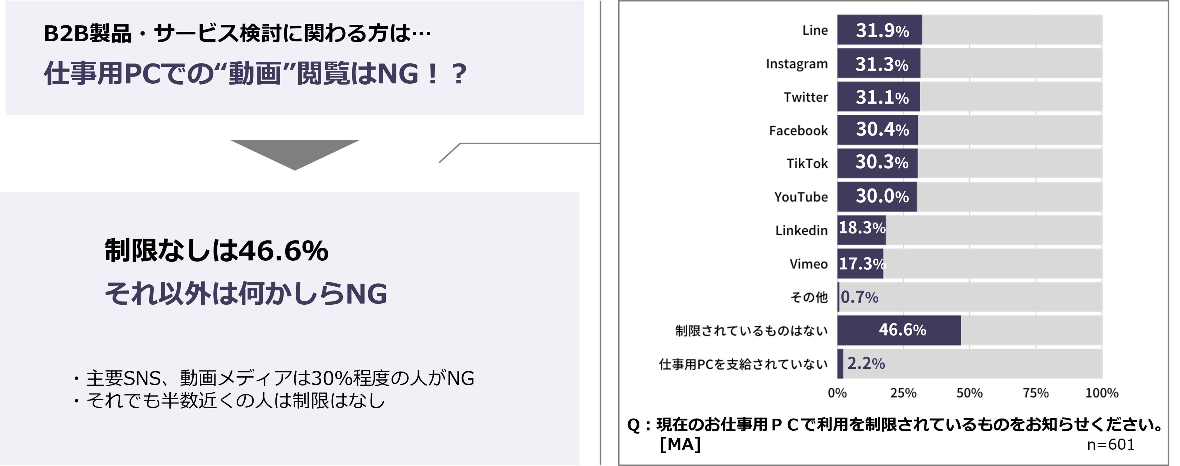 ・ 仕事用PCの利用制限なし(SNS・動画閲覧サイト)は46.6% それ以外はNGのものあり