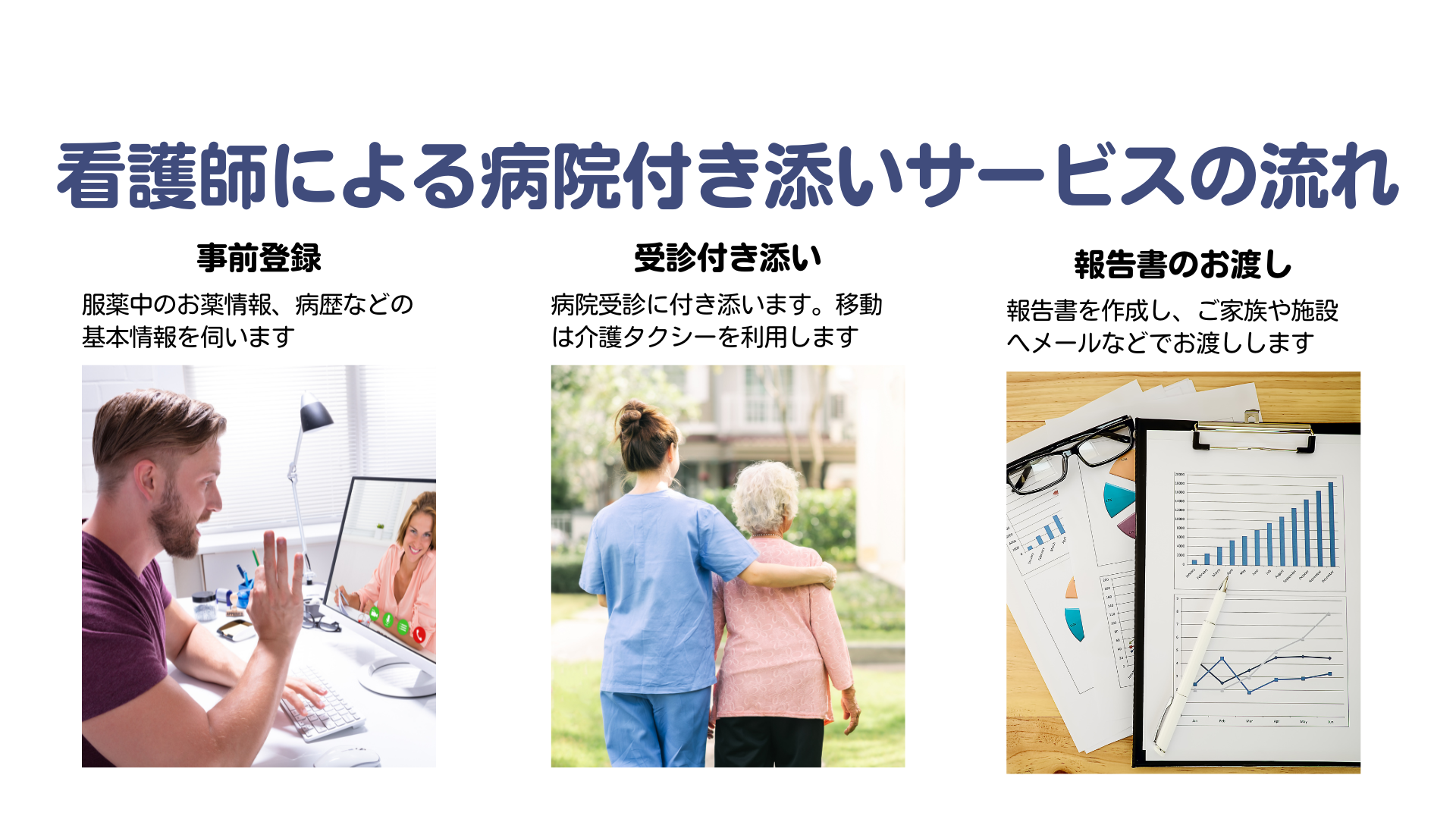 具体的にはまず会員登録をいただき、病院受診に付き添いが必要な方の服薬中のお薬情報・病歴などの基本情報の登録を行います。その上で病院を受診する日時のご予約をいただきます。当日は必要に応じて介護タクシーがご自宅まで迎えに伺い、病院内では看護師が受診の付き添いを行います。
