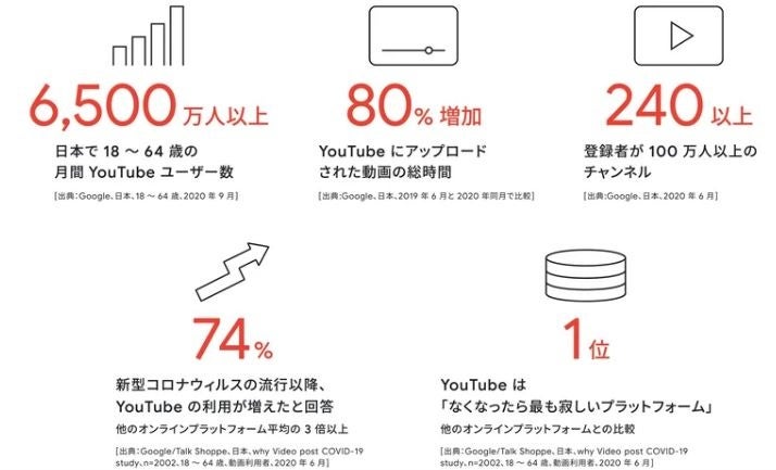 google社の調査によると、2020年9月のYouTube月間利用者数(18〜64歳)は6,500万人を超え、「新型コロナウイルスの流行以降にYouTubeの利用が増えた」と回答した人は74%に達し、YouTubeにアップロードされた動画の総時間数は前年同月比で80%増加しているということです。