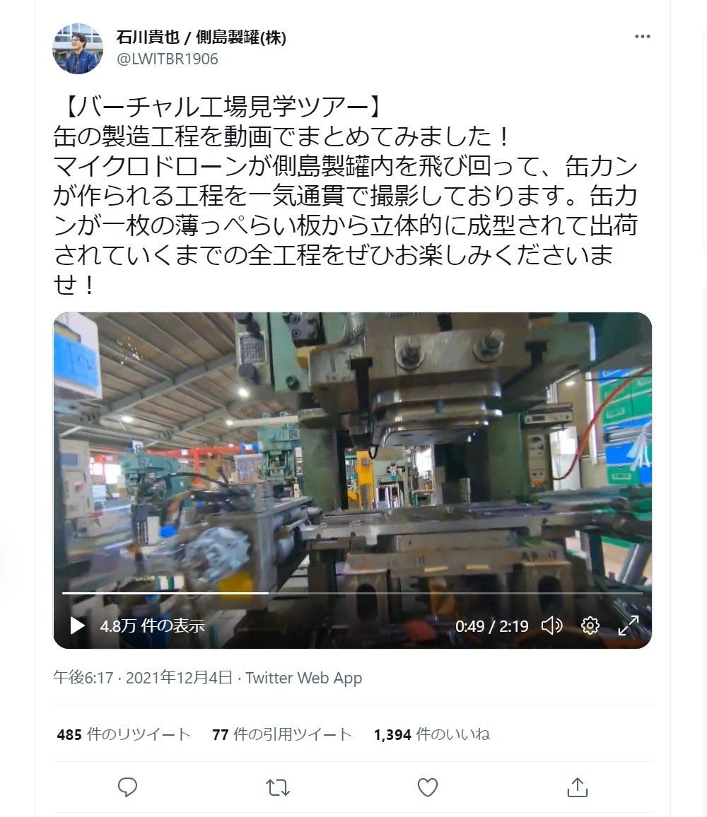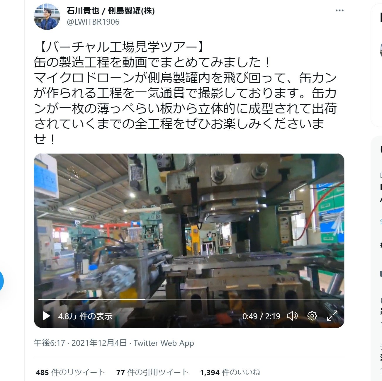 コロナ禍で自分たちも世の中も苦しい中、何か少しでも世の中を明るくできることはないかと考えていた時に、このマイクロドローンを使ったバーチャル工場見学を共同企画しました。缶の製造工程を一気通貫で撮影して臨場感や迫力を出すことで外に出られない人たちにもお楽しみいただけるようにといういう想いでしたが、このような賞を頂くことができてとても嬉しいです。