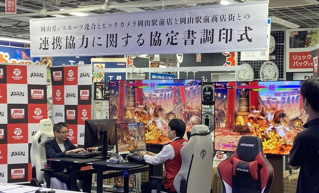 調印式後半には親睦を深めるため「ストリートファイター6」を使用して岡山駅前商店街理事長(土居 和正)とビックカメラ岡山駅前店店長(小野 雅彦)の交流マッチも実施。