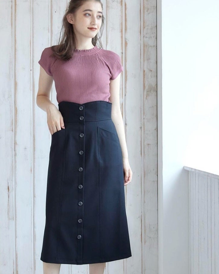 ハイウエストと釦デザインが縦ラインを際立たせてくれるスタイルアップ効果抜群なスカート。