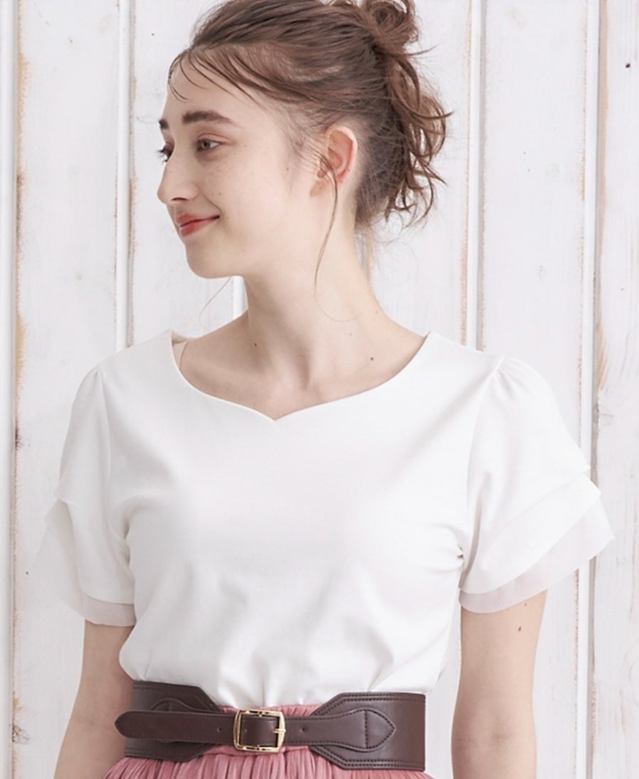 今年らしい袖コンシャスなカットソーはハートネックにすることでオフィスでも着られるきちんと感を演出。
