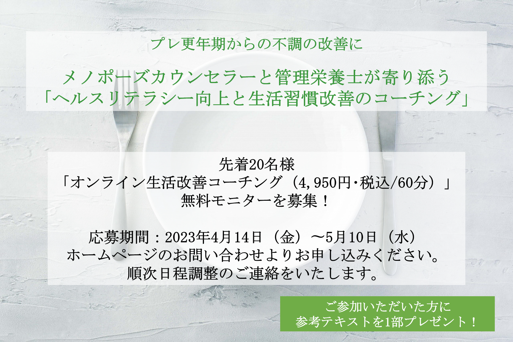 社会で活躍するミドルエイジが、からだの不調でキャリアを諦めることなくウェルビーイングが実現できる社会をめざす、ウエルキー株式会社(本社:京都市下京区、代表取締役:⽥中明⼦、以下「ウエルキー社」)では、4⽉14⽇(金)より、ウエルキー社サービス「オンライン生活改善コーチング(4,950円・税込/60分)」の無料モニターを募集します。(先着20名様、https://wellkee.co.jp )