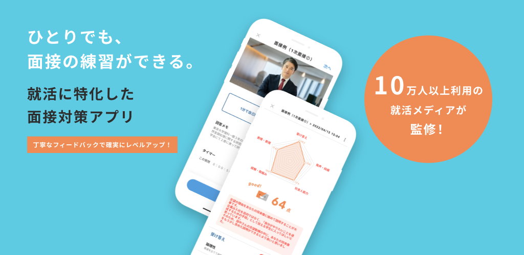 就活支援事業として就活メディアを運営している当社は、さらなる就活支援の拡大・強化のため、AI技術に強みを持つFiah株式会社と、就活の対策に特化した面接練習アプリを共同開発いたしました。 就職活動において、面接は避けることのできない選考フローであり、「どのように面接の対策をしたらよいか」というのは、就活生の悩みの種のひとつとなっています。さらに、昨今の情勢に多大なる負荷を与えた新型コロナウイルスのまん延は、就職活動にも大きな影響を及ぼしました。コロナ禍の就活生は、直接的に人と接触する機会が制限され、コミュニケーション能力を培う環境が自然に減っています。それにもかかわらず面接の場では、自分の能力や価値観について自分の言葉で語る機会が必ず設けられ、ここで発揮されるコミュニケーション能力が選考の際に最も重要視されます。また、対策の情報を得ようにも、Webコンテンツでの収集がメインとなり、直接的に客観的な評価やフィードバックを受け取れない状況にありました。 このような課題を解決するために開発されたのが、「ひとりでも、面接の練習ができる。」をコンセプトとした面接練習アプリです。このアプリには、模擬面接機能、質問対策機能、振り返り機能という、面接力向上に必要な基本的な機能が搭載されており、それらをスマートフォンひとつで体験できるという特徴があります。模擬面接を通して、面接の練習を何度も行うことで、面接に必要なコミュニケーション能力を培うことができ、振り返り機能では高性能のAIによる客観的なフィードバックを得ることができます。