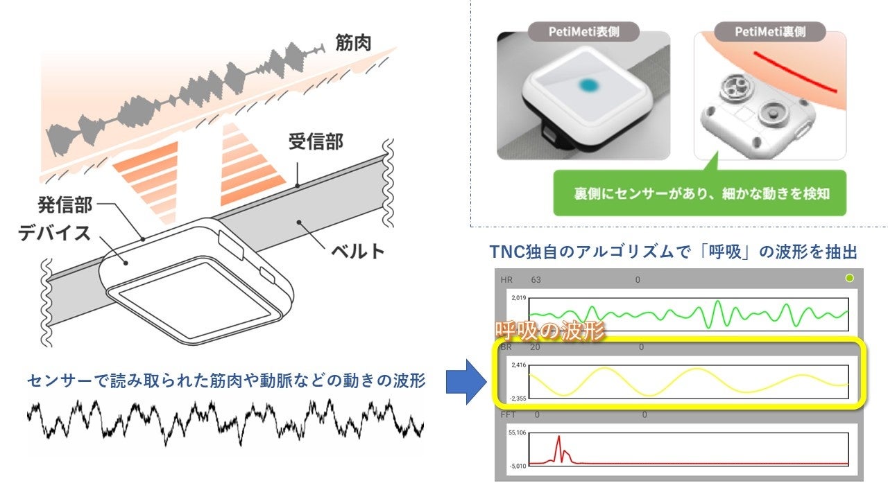 このセンサー(TNSC*)が呼吸の際に発生する皮膚・筋肉・血管などの細やかな動きを検知し、TNC独自のアルゴリズムにより呼吸の波形を抽出し、1分間当たりの平均呼吸数をスマートフォンの専用アプリの画面に表示します。