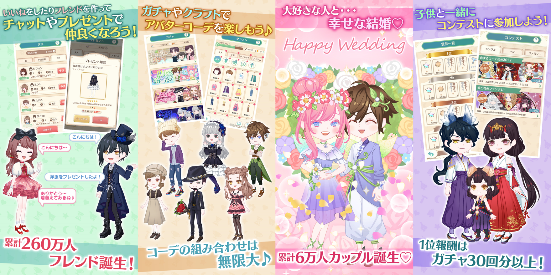 『恋するコーデ ペアリウム』は2021年10月27日に、iOS・Android両端末にてリリースした、恋愛ゲームとアバターゲームを融合させた恋愛アバターゲームです。豊富な種類のアバターアイテムを使って、自分だけのアバターコーデを作成し、着せ替えや他のユーザーとのコミュニケーション、また「結婚」「出産」というイベントを仮想空間で楽しむことができます。2022年6月時点で累計14万ダウンロードを突破し、累計約6万人ものゲーム内カップルが誕生しています。