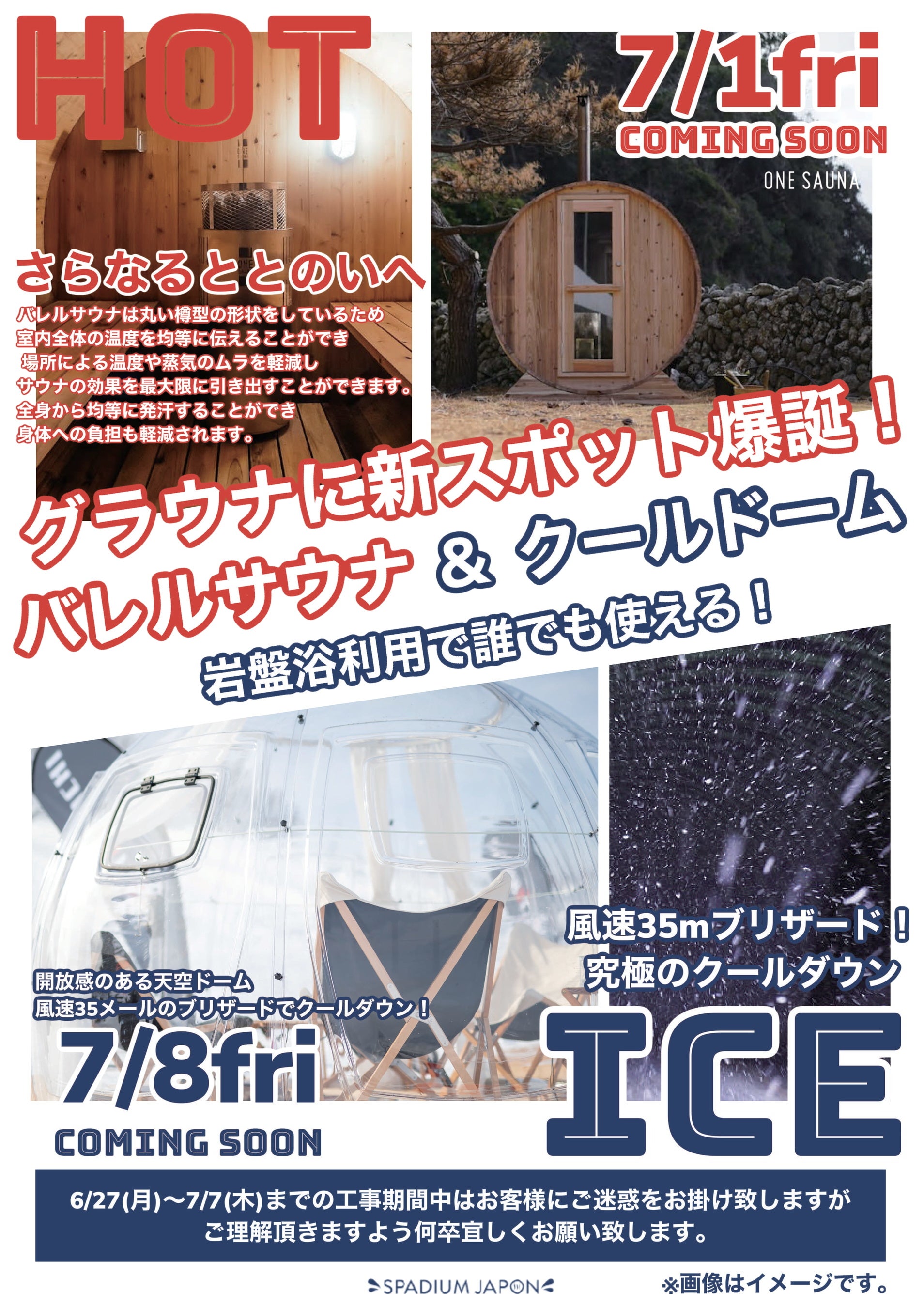 さらに、ここにしかない日本初の風速35mのブリザードを新体験できる屋外のクールドームも7月8日(金)に登場。サウナの効果を最大限に引き出すバレルサウナで、心身ともに“ととのう”を