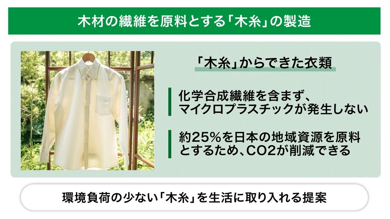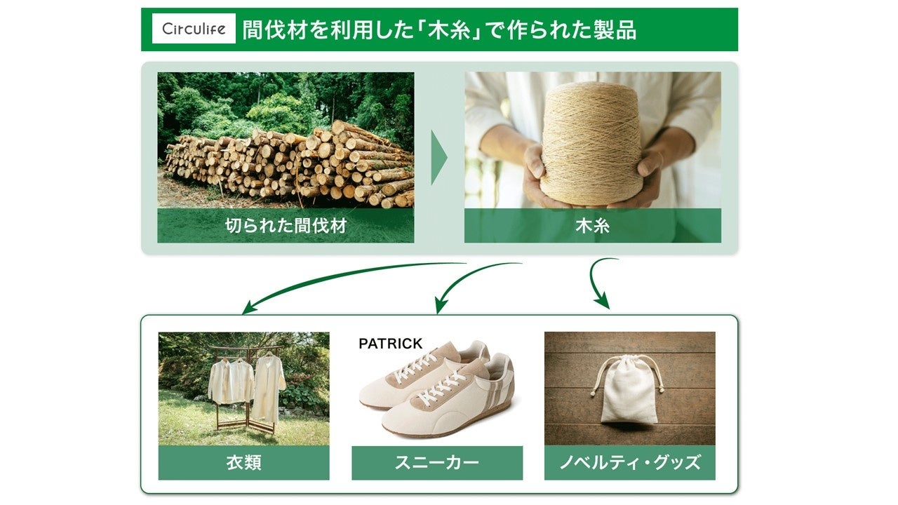 株式会社Circulifeが着目した「木糸」は木材の繊維を原料とする糸のことで、糸の場合は50%、生地の場合は約25%を間伐材など日本の地域資源とその他の天然素材を原料として製造するため、素材から製品まで約98%を輸入に頼っている現状に比べ、CO2削減に直接寄与できます。また、海洋汚染を含む環境問題を少しでも解決するべく、化学合成繊維を含まず、環境負荷を大幅に抑えられる「木糸」を生活に取り入れることを提案しています。