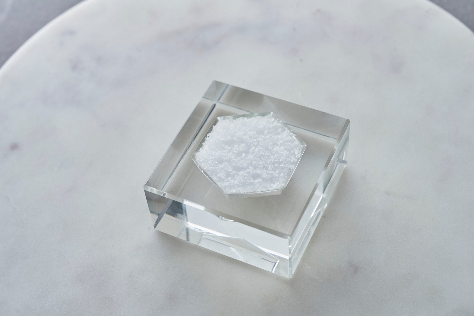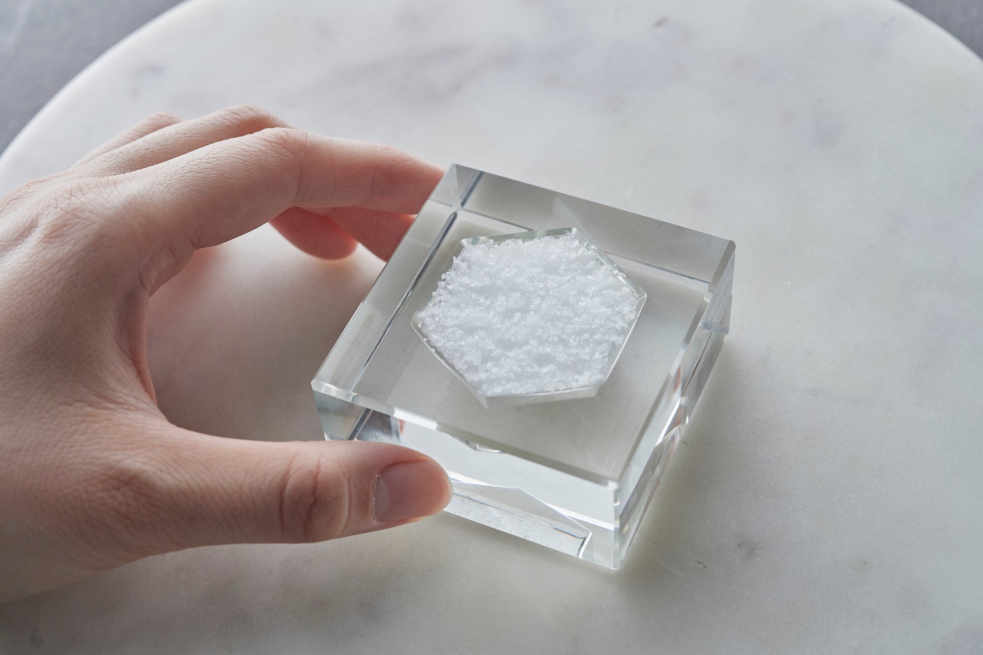 「安定や調和」を意味する “正六角形” にすること。透明感のあるガラスを採用し、モダ ンに進化した盛り塩の器は、どの場所に置いてもしっくりと馴染み、目にした人たちの コミュニケーションを生みだし、塩のエネルギーが感じられるモノに仕上がりました。