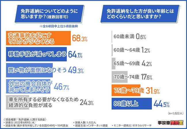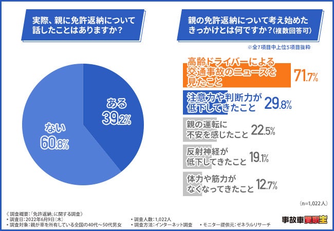 事故車買取王(本社所在地:東京都八王子市、代表取締役:野田頭 一雄)と事故車買取王「埼玉店」「町田相模原店」「横浜店」「山梨店」は、親が車を所有している全国の40代~50代男女を対象に、「免許返納」に関する調査を実施しました。