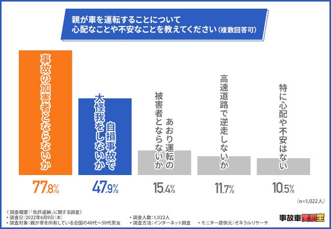 そこで、「親が車を運転することについて心配なことや不安なことを教えてください(複数回答可)」と質問したところ、『事故の加害者とならないか(77.8%)』と回答した方が最も多く、次いで『自損事故で大怪我をしないか(47.9%)』『あおり運転の被害者とならないか(15.4%)』と続きました。