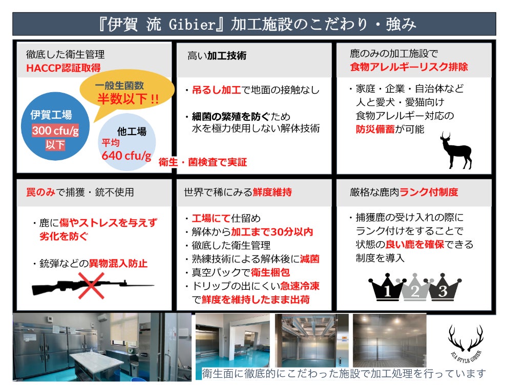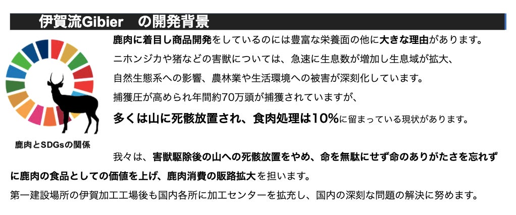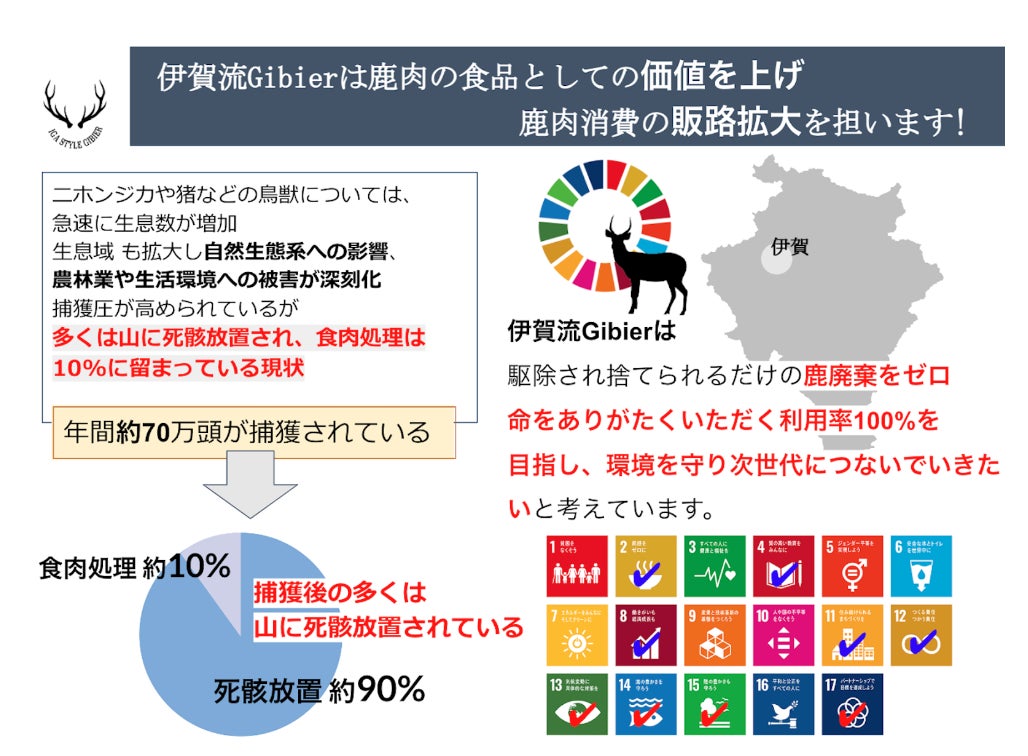 白石環境株式会社(本社・栃木県上三川町 、代表取締役・白石純也)と株式会社ピーテンプル(本社・東京都世田谷区、代表取締役・江尻仁)は、鳥獣被害解決で駆除され捨てられるだけの鹿廃棄をゼロ・いのちをありがたくいただく利用率を100%にしたいという想いで、鹿肉の食品としての価値を上げ、鹿肉消費の販路拡大に努めるべく伊賀流Gibier(イガリュウジビエ)を創立しました。