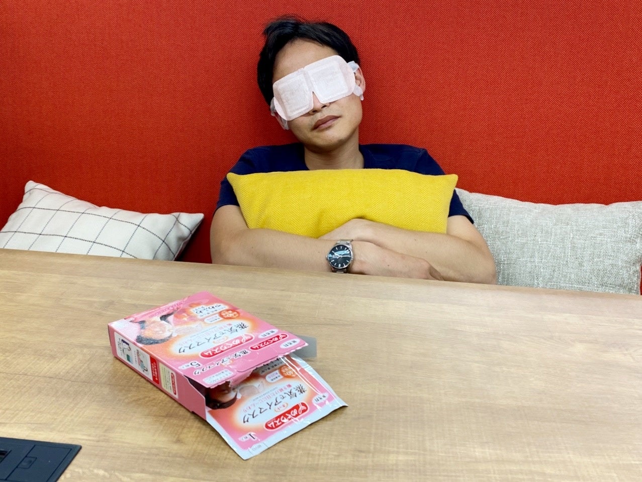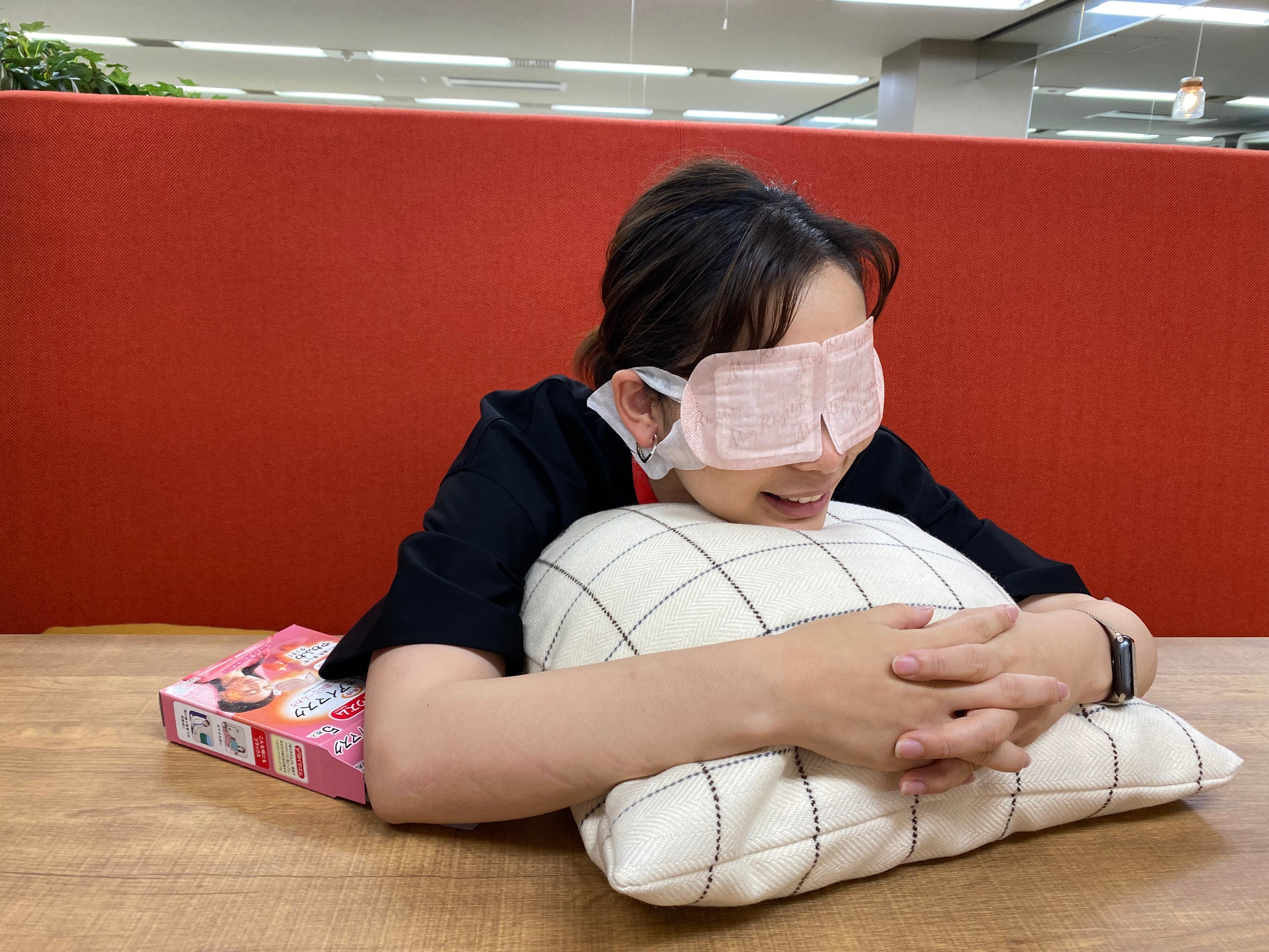 ロッテ社内で花王「めぐりズム 蒸気でホットアイマスク」を使った『ちょこっとオフタイム』の様子