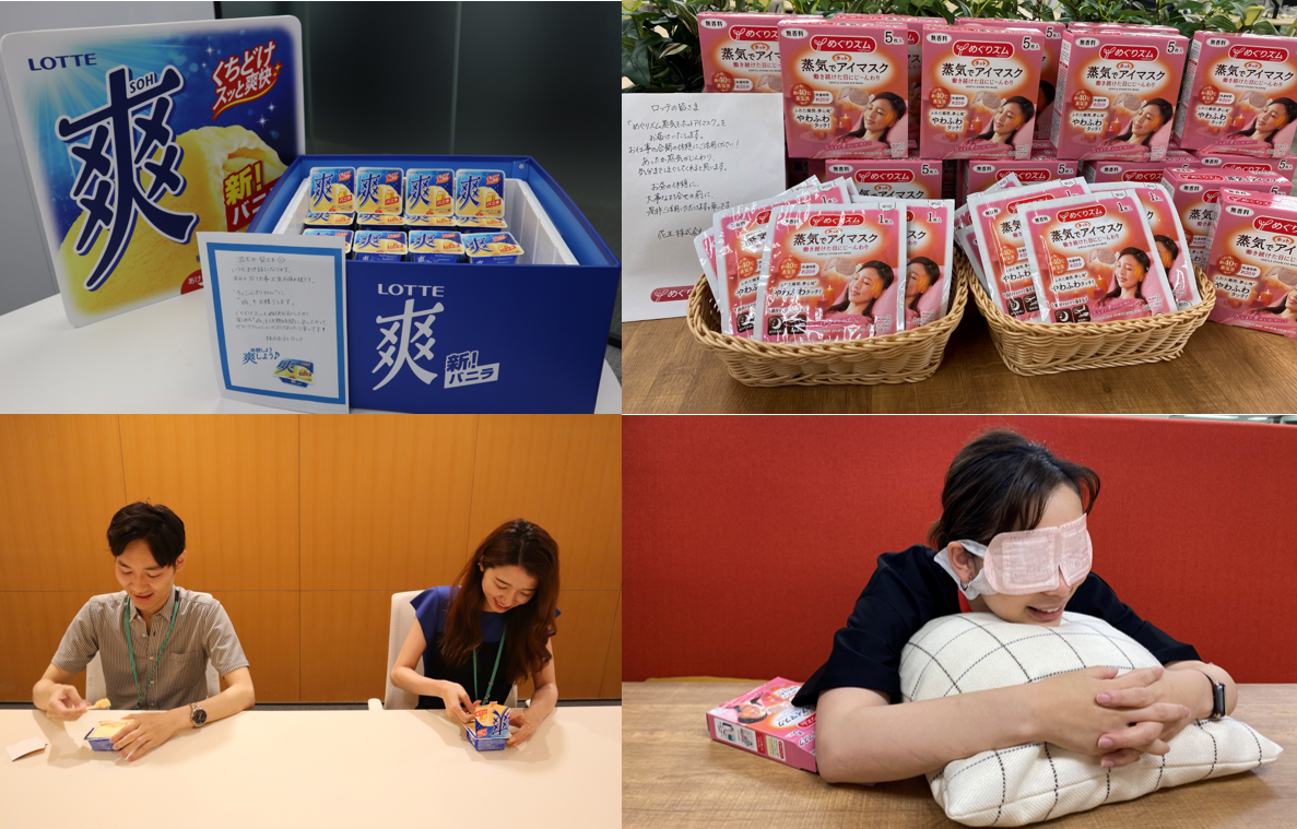 初の取り組みとなる今回は、両社の社員を対象に『ちょこっとオフタイム』の取得を勧めるべく、それぞれの商品を使った「休み方交換」を実施しました。ロッテ本社には花王「めぐりズム 蒸気でホットアイマスク」と自社の「爽」、花王本社ではロッテ「爽」と自社の「めぐりズム 蒸気でホットアイマスク」を自由に手に取れるトライアルコーナーを設置し、オフィス内で社員が各商品を体験できる環境を創出。“くちどけスッと爽快”な美味しさが特長の「爽」を食べてリフレッシュする“「爽」流の休み方”と、心地よい蒸気で目と目元を温かく包み込み、気分をリラックスする“「めぐりズム 蒸気でホットアイマスク」流の休み方”を互いに交換し、楽しく効率的かつ自分にあった「休憩・休息」のあり方を見つけるきっかけをつくりました。