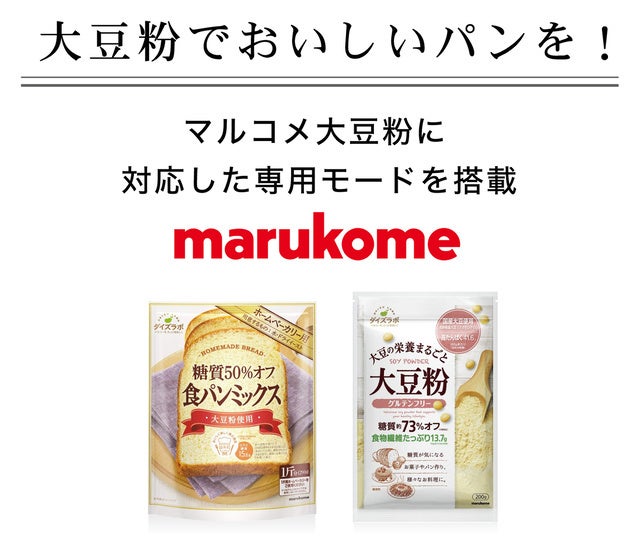 本製品は、マルコメダイズラボの「 糖質50%オフ食パンミックス」「大豆粉」を使用した時に最高の美味しさを引き出せる独自のプログラムを搭載しています!