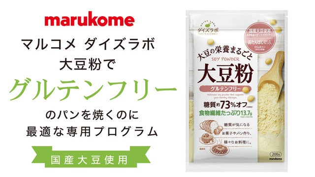 マルコメダイズラボ大豆粉専用モード搭載で、米粉などと合わせる事でどなたでも簡単にグルテンフリーのパンが美味しく焼けます。