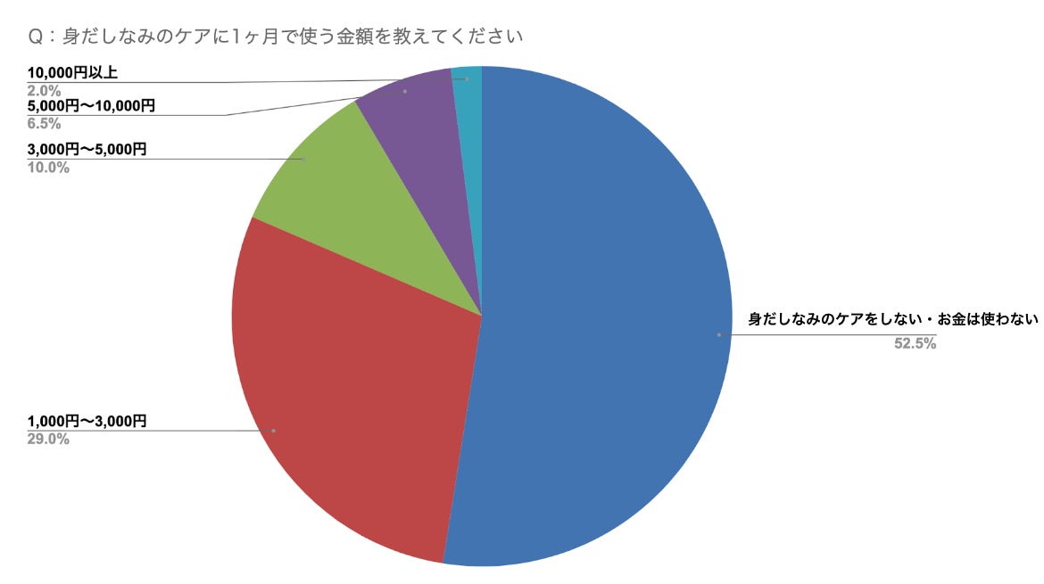 一方で、「身だしなみケアへの投資状況」を男性に伺うと過半数以上の方が『身だしなみのケアをしない・お金を使わず自身で対応する』という回答結果が出ており、重要ではあると言う認識と意識の低さのギャップが目立つ結果となりました。