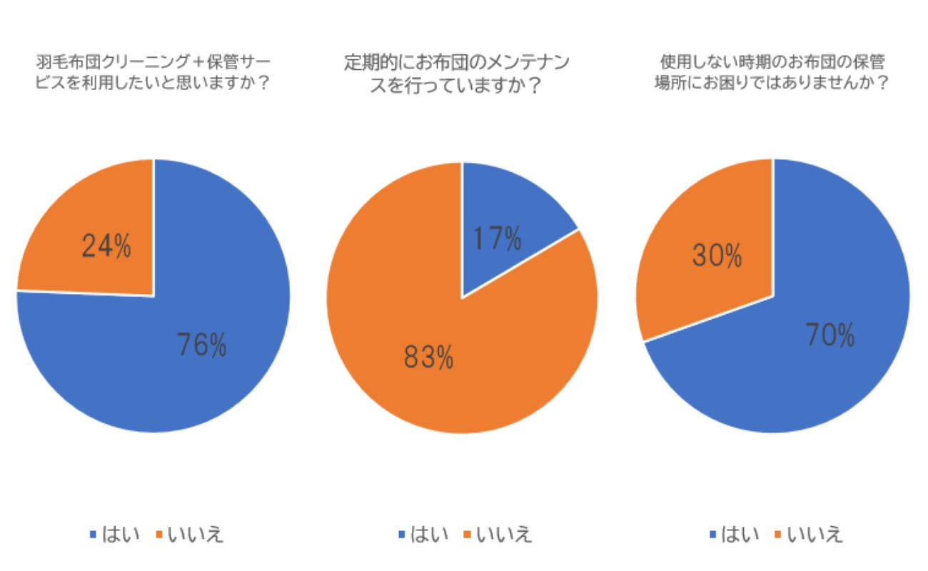 6月末に甲州羽毛ふとん俱楽部会員(約2,700人)を対象に実施したアンケートでは、7割以上が「クリーニング&保管サービス」を希望しているという結果も出ており、多くのご要望をいただきました。また、8割以上が「定期的のお布団のメンテナンスを行っていない」と回答。7割が「羽毛ふとんの保管場所に困っている」という回答をいただきました。