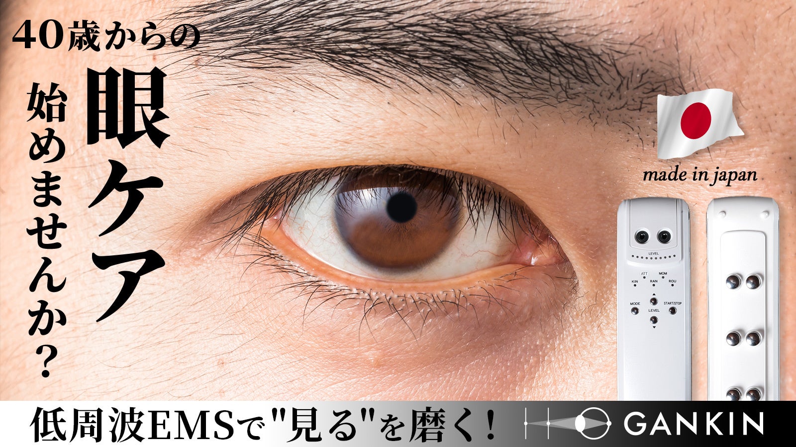 GANKINとは、目を酷使しがちな現代人に「低周波EMS」と「ラジオ波」の二刀流で徹底的に眼の周りの筋肉にアプローチする商品です。