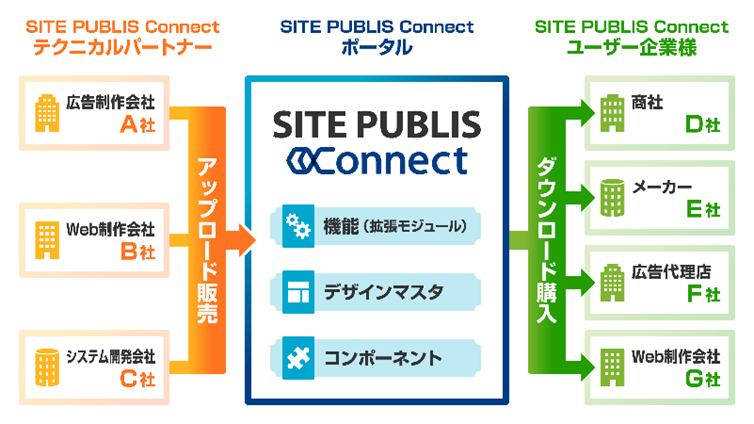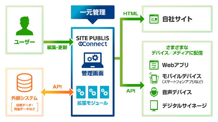 Webサービスや基幹システムなどと自由に連携し、ヘッドレスで配信可能 必要な機能をオンデマンドで迅速に拡張できるコネクティングマネジメントシステム SITE PUBLIS Connect