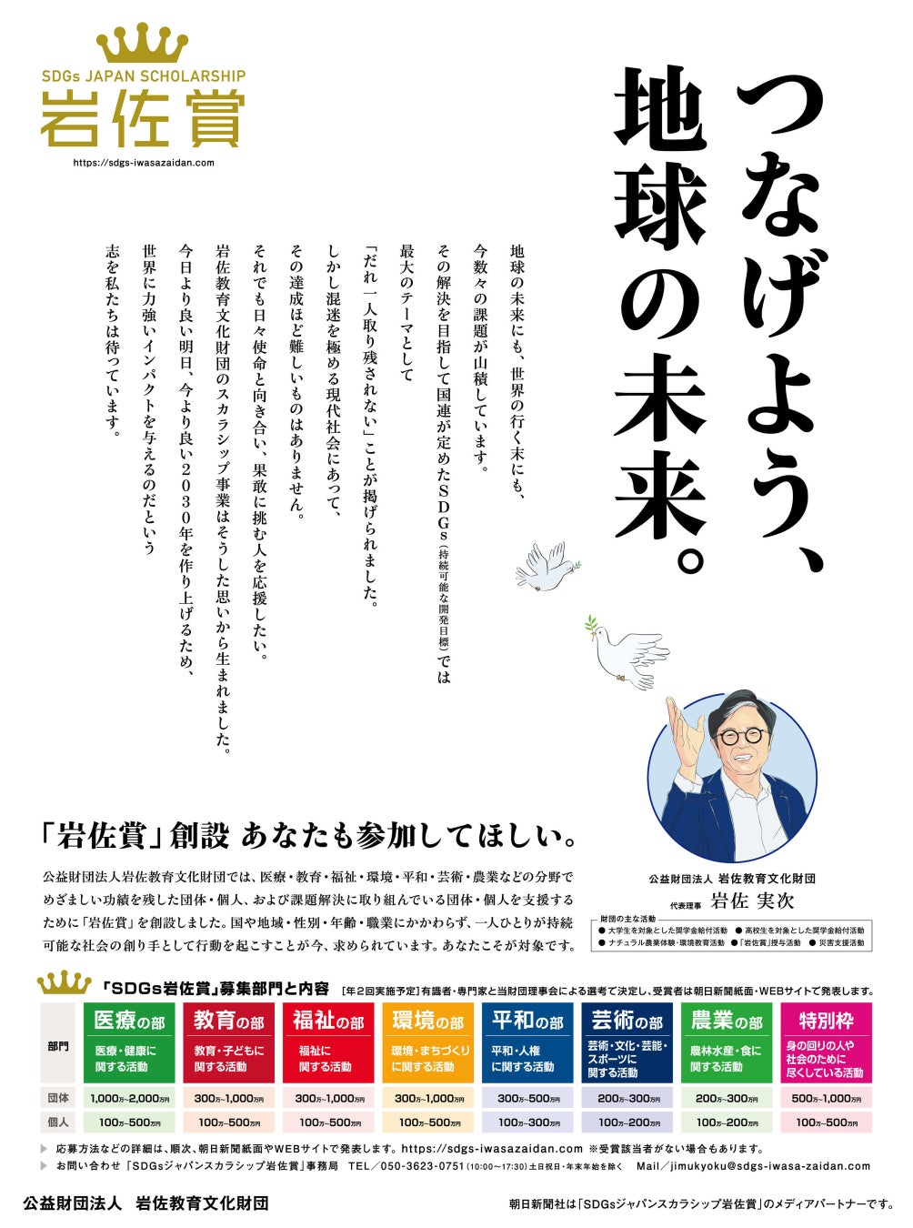 公益財団法人岩佐教育文化財団(所在地:東京都豊島区、代表理事:岩佐実次)は、医療・教育・福祉・環境・平和・芸術・農業などの分野でめざましい功績を残した団体・個人、および課題解決に取り組んでいる団体・個人を支援するため、「SDGsジャパンスカラシップ岩佐賞」を創設いたしました。6月27日に第1回の応募受付を開始いたします。