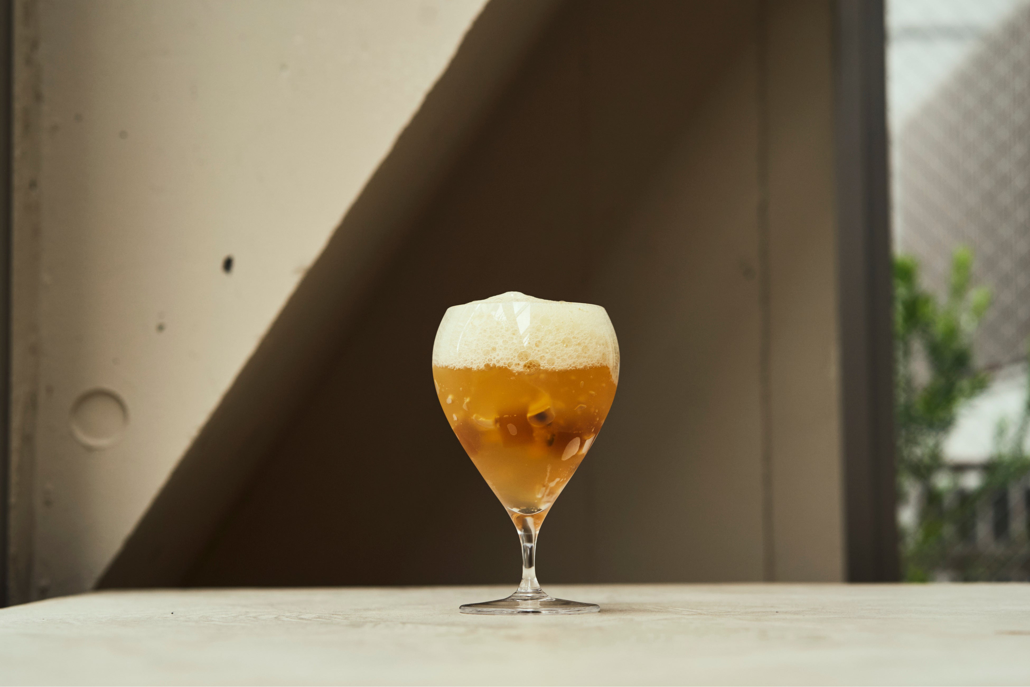 ビールのゼリーとナタデココに、寒天で固めたホワイトバルサミコと白ワイン、トップには、泡状にしたパッションフルーツを重ね、ビールのような見た目の一皿に。