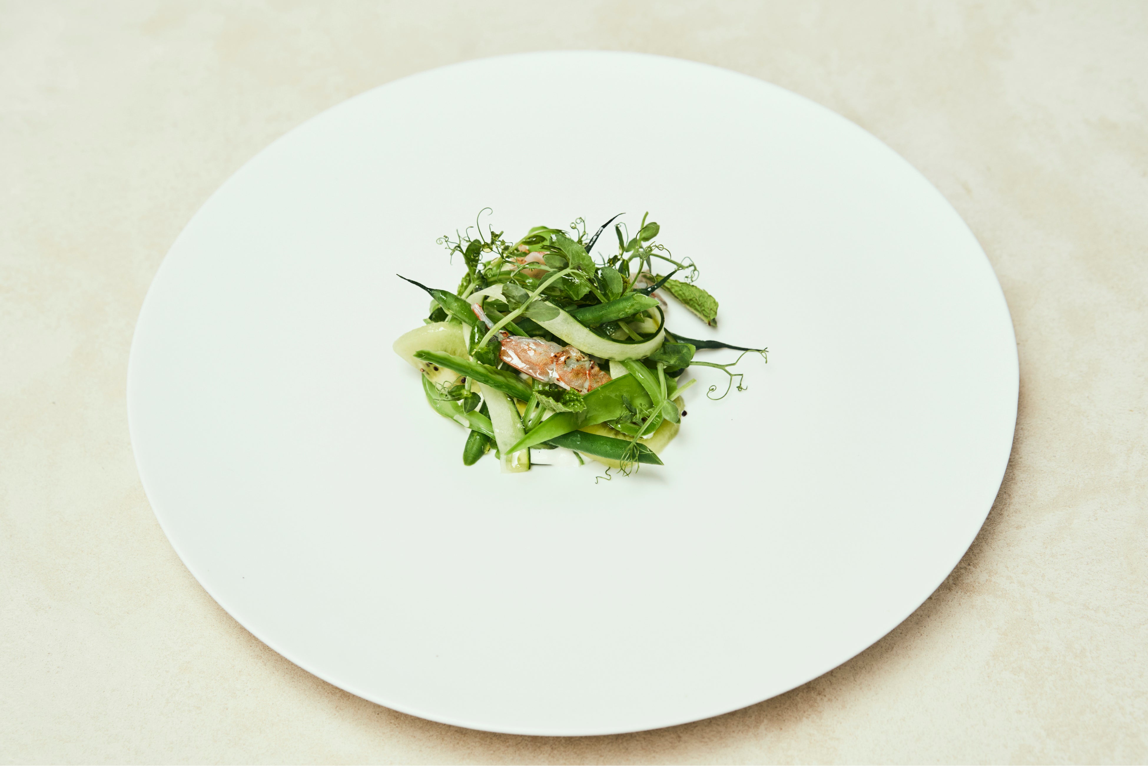 茹で上げたインゲンを柑橘系のドレッシングと生姜で味付けし、キウイやきゅうり、エビなどを添え、下にひいたフロマージュブランのソースと共にお召し上がりください。