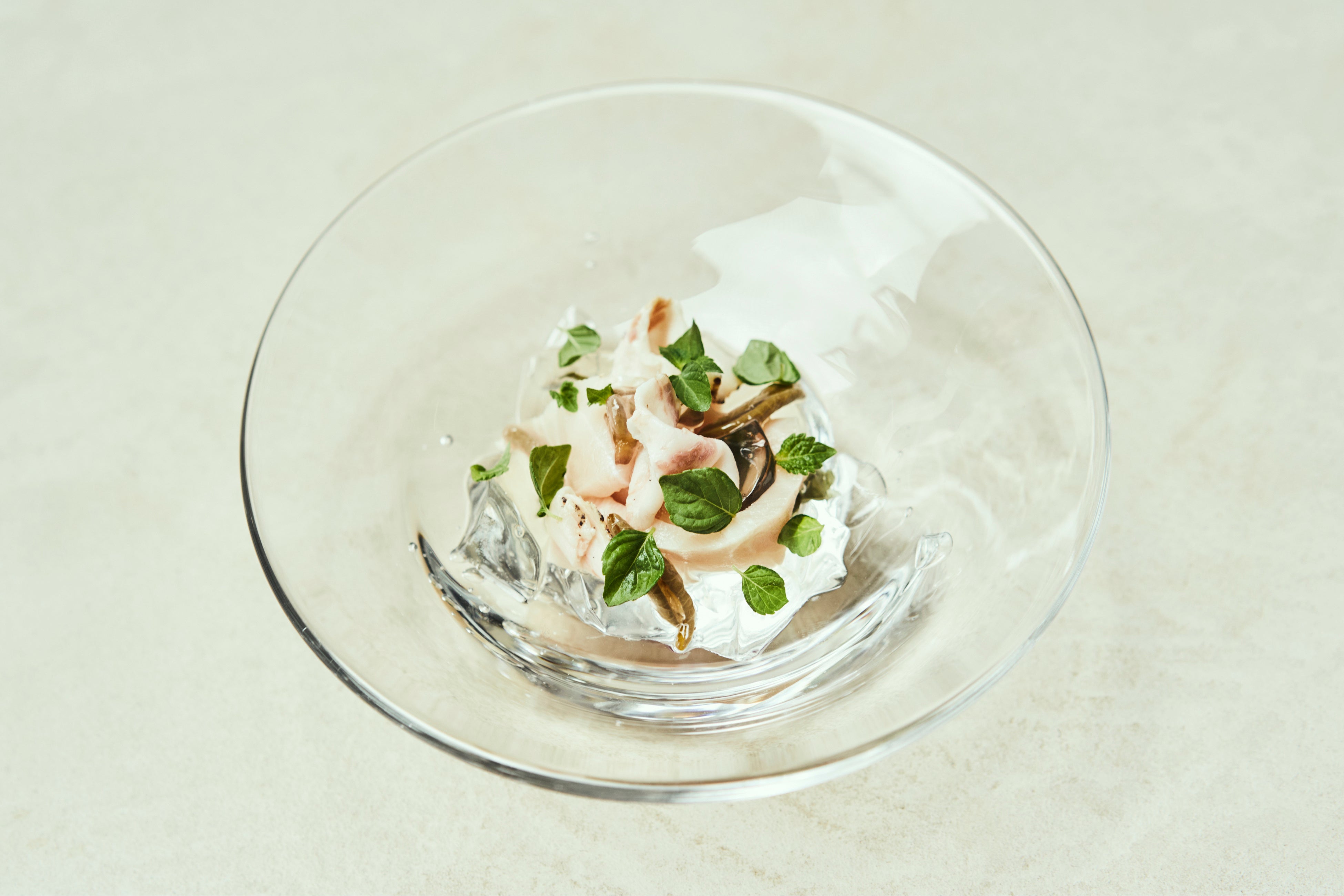 ライムの酸味、青唐辛子の辛み、、コリアンダーの香りのバランスが取れたエスニックとフレンチが融合した一品です。(2)チョウザメとジャスミンジュレ